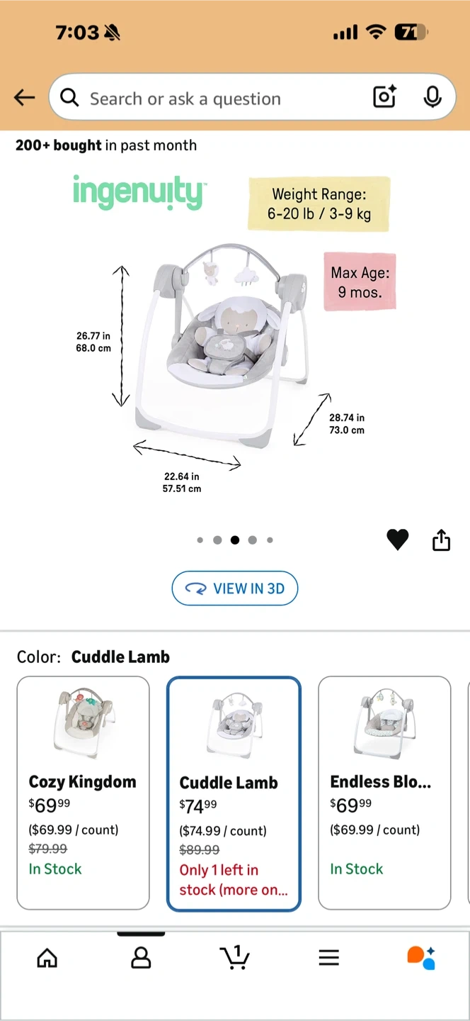 Ingenuity Cuddle Lamb baby swing. Features a weight range of 6-20 lbs and a max age of 9 months. Dimensions are 26.77 inches high, 22.64 inches wide, and 28.74 inches deep. It's designed for babies up to 9 months old.