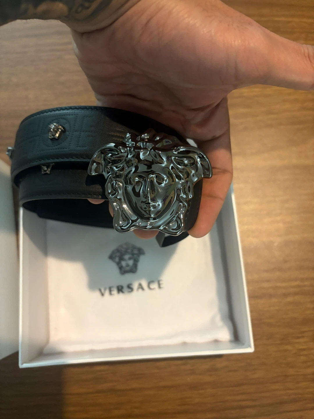 Black leather Versace belt featuring the iconic Medusa head buckle. It's in excellent condition and comes with its original box. This belt adds a statement to any outfit.