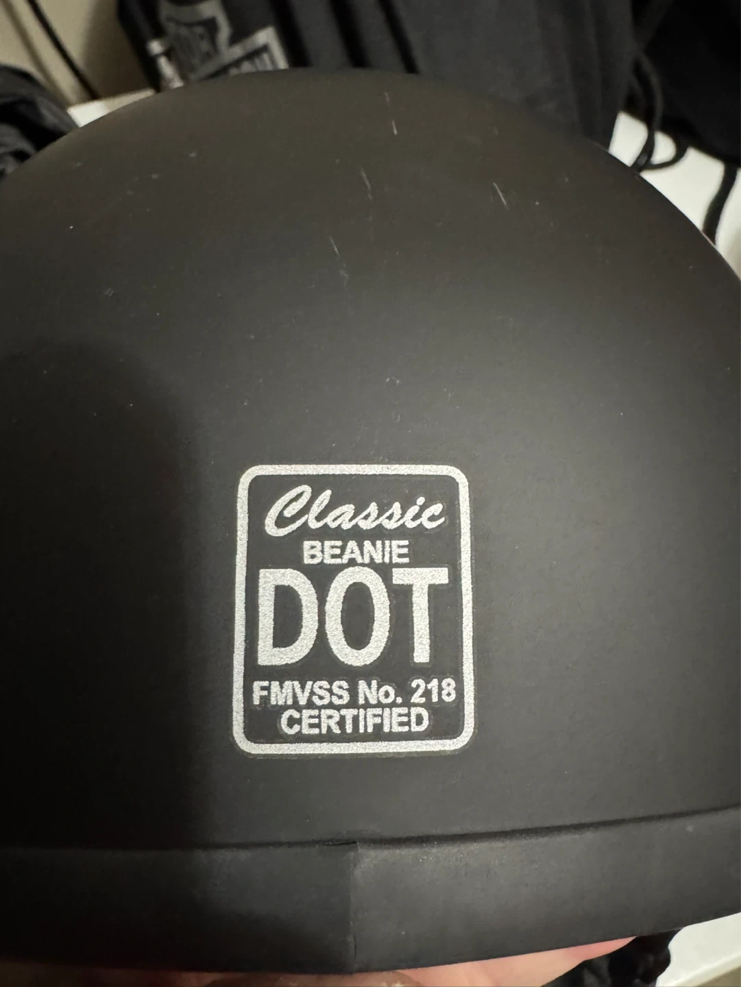 New matte black motorcycle helmet with a classic beanie style. It's DOT FMVSS No. 218 certified for safety. This helmet has a comfortable padded interior and adjustable straps.