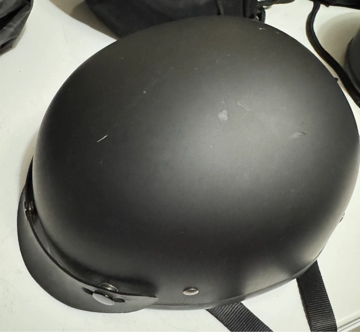 New matte black motorcycle helmet with a classic beanie style. It's DOT FMVSS No. 218 certified for safety. This helmet has a comfortable padded interior and adjustable straps.