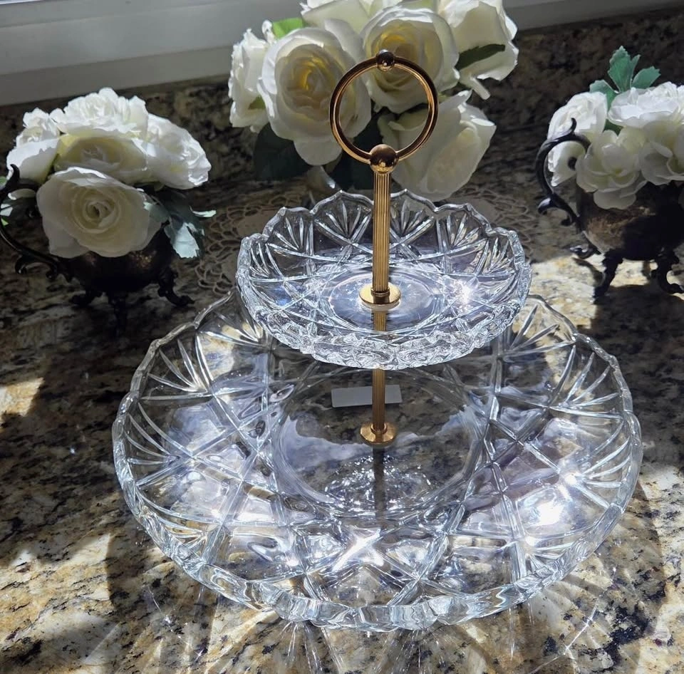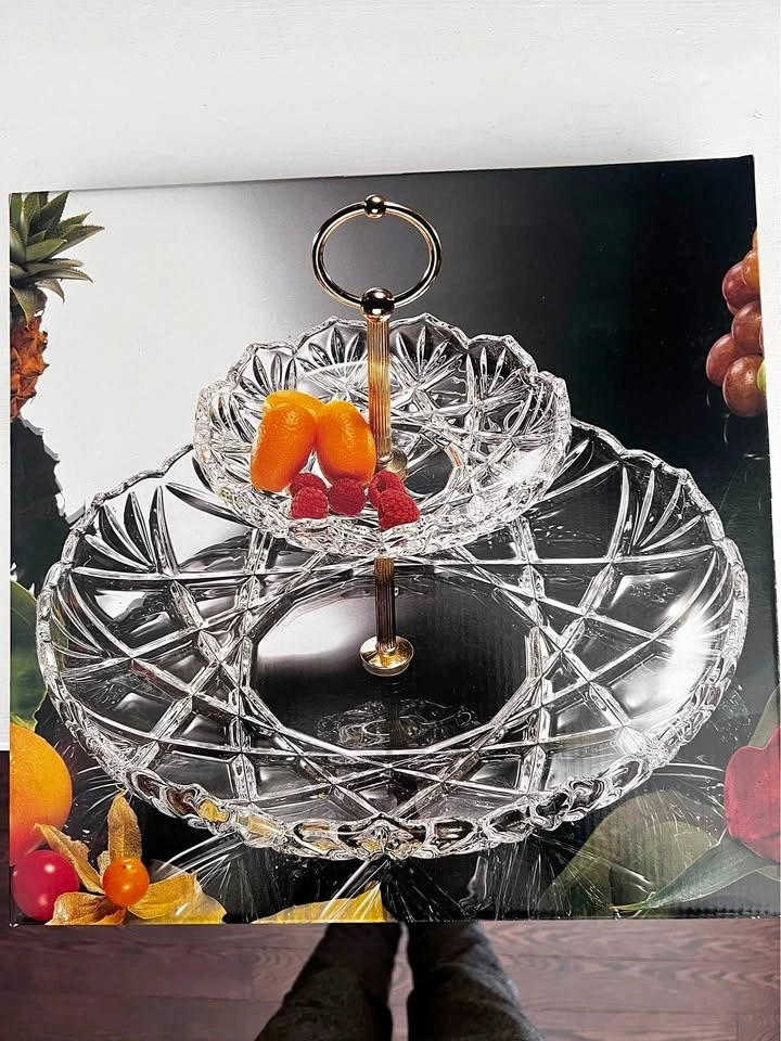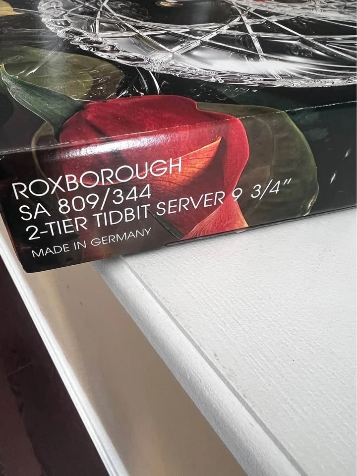 New, open box. This Mikasa Roxborough 2-Tier Tidbit Server is a stylish and elegant serving tray made of glass and crystal. It's designed with a clear color and disassembles for convenient storage. Manufactured in Germany, this set includes 2 items and is perfect for adding a touch of sophistication to any dining or entertaining experience.