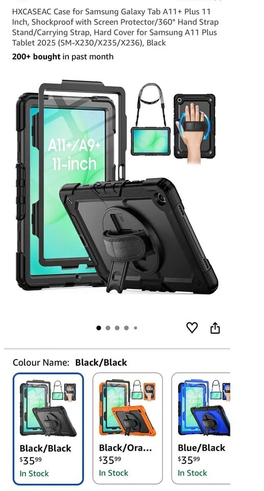 New HXCASEAC Case for Samsung Galaxy Tab A11+ Plus 11 Inch, Shockproof with Screen Protector/360° Hand Strap Stand/Carrying Strap, Hard Cover for Samsung A11 Plus Tablet 2025 (SM-X230/X235/X236), Black.