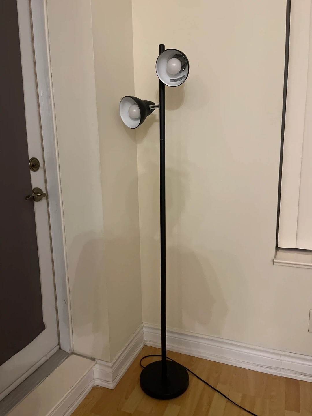 This is a black double-head floor lamp. It has two adjustable lights on a tall stand. The base is round and steady. Perfect for lighting up a reading corner or any room!