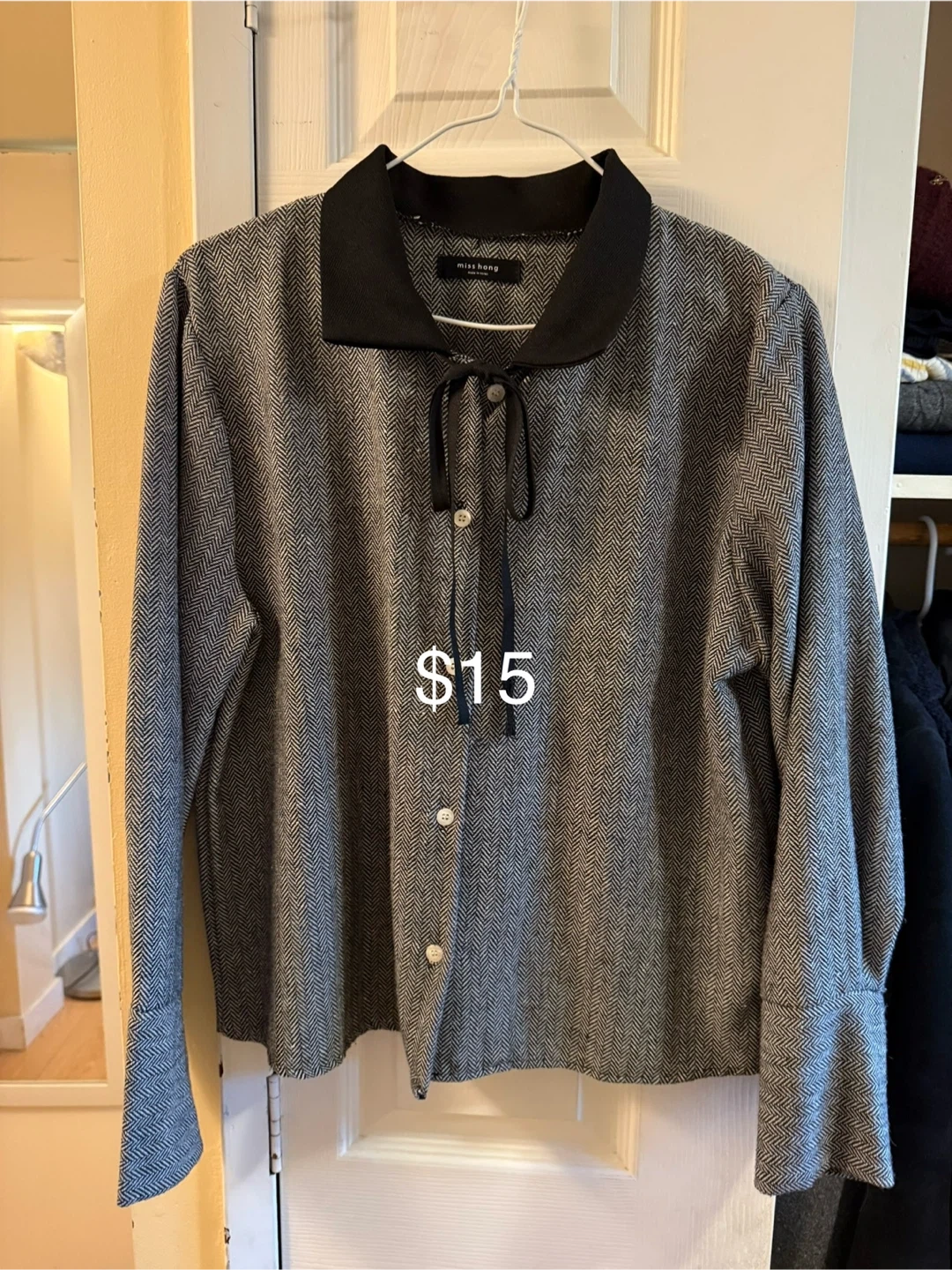 This blouse features a classic grey herringbone pattern and a contrasting black collar with a tie accent. It's got a button-up front and bell sleeves. A stylish top for any occasion!