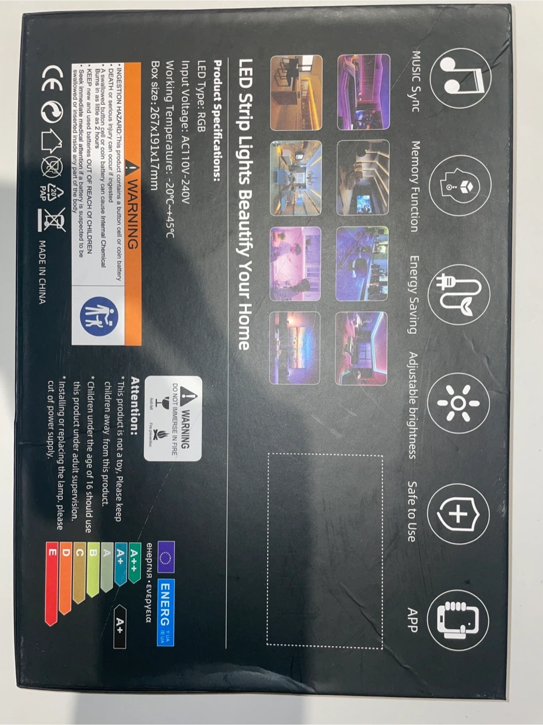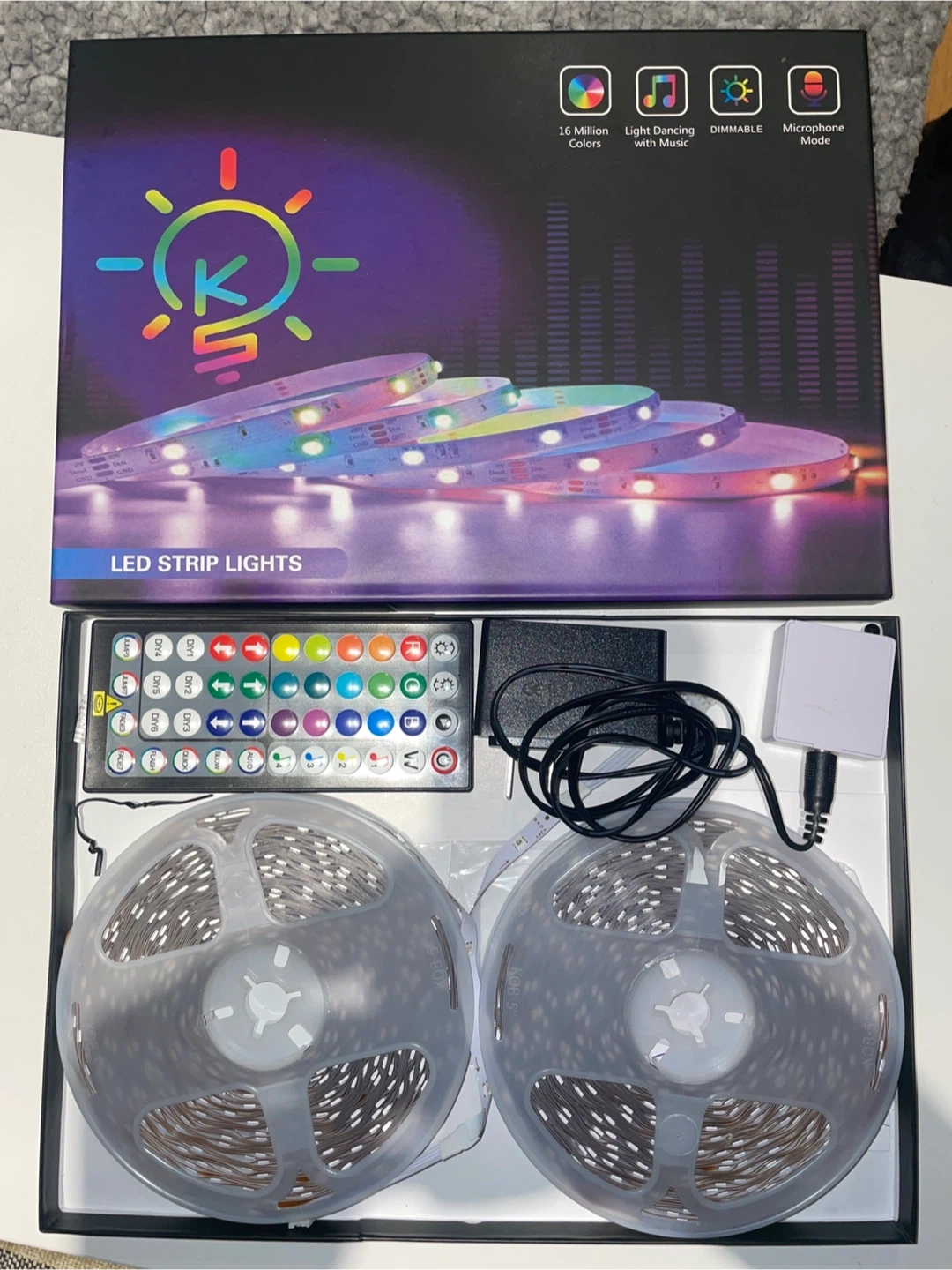 Two rolls of RGB LED strip lights included, capable of 16 million colours and light dancing with music. They're dimmable and come with a remote control. Input Voltage: 110V-240V. Never used!