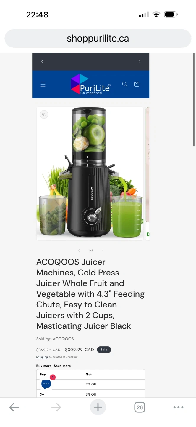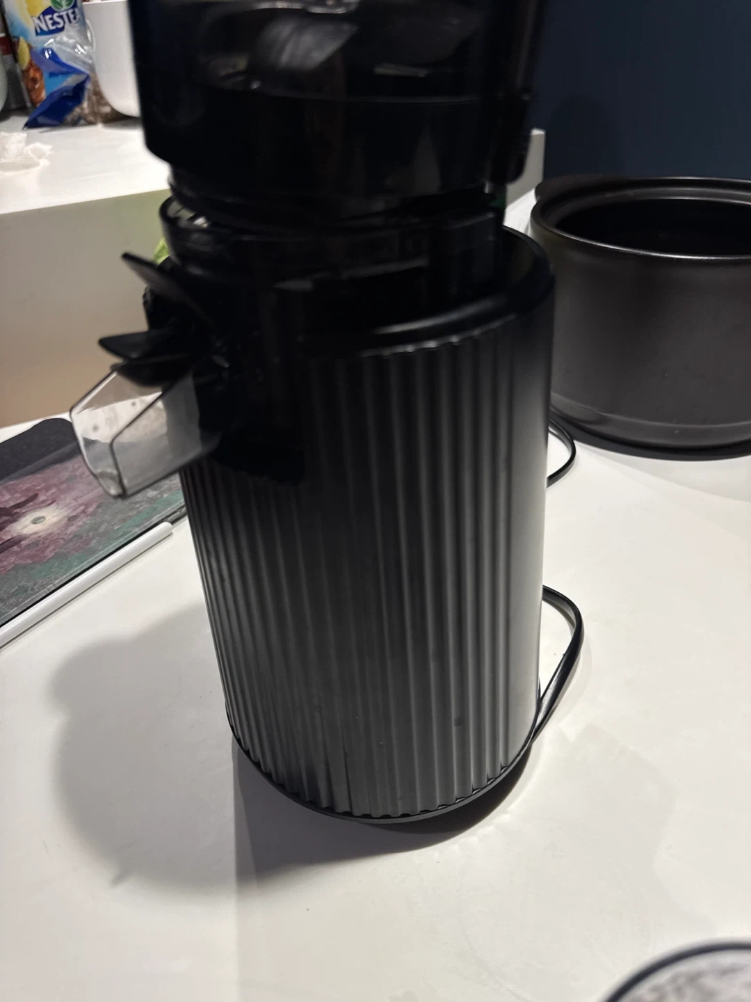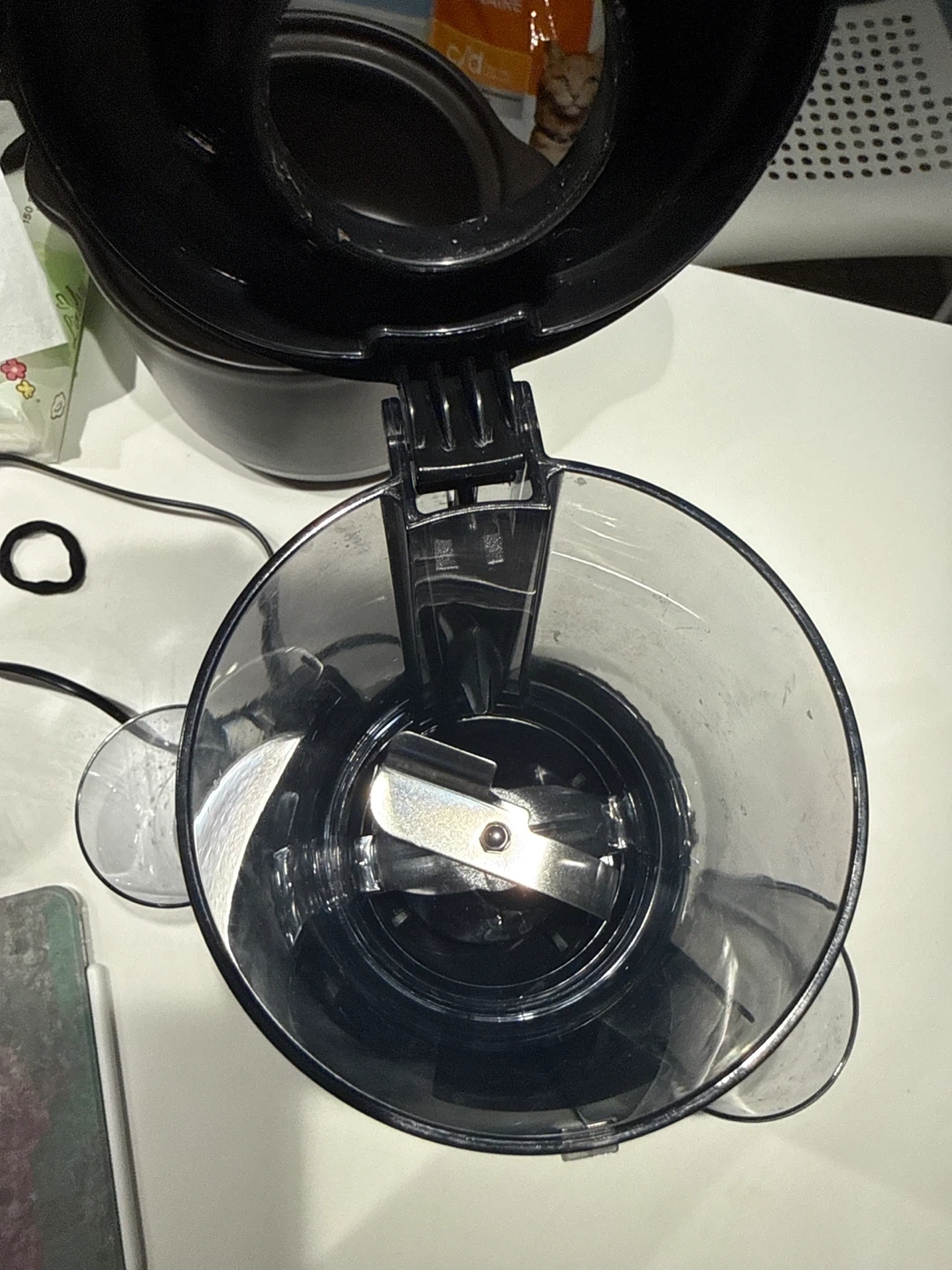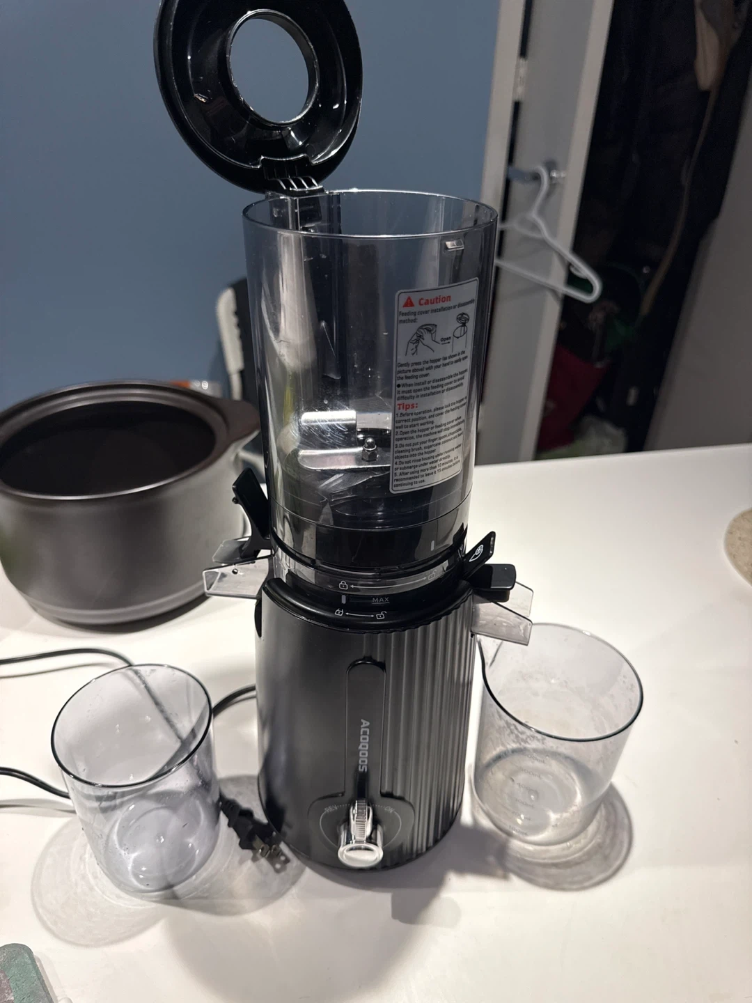 This is an ACOQOOS food processor. It has a powerful motor for chopping and blending. It's black and comes with two plastic containers.