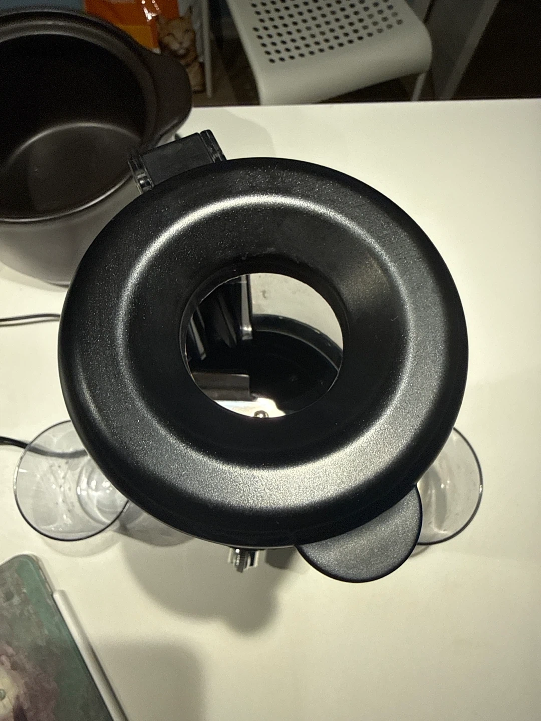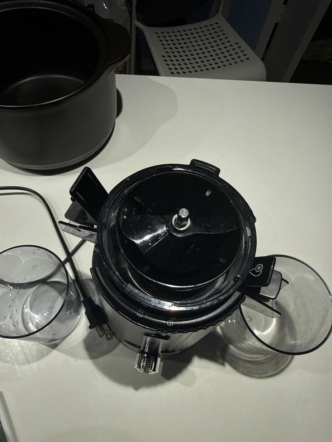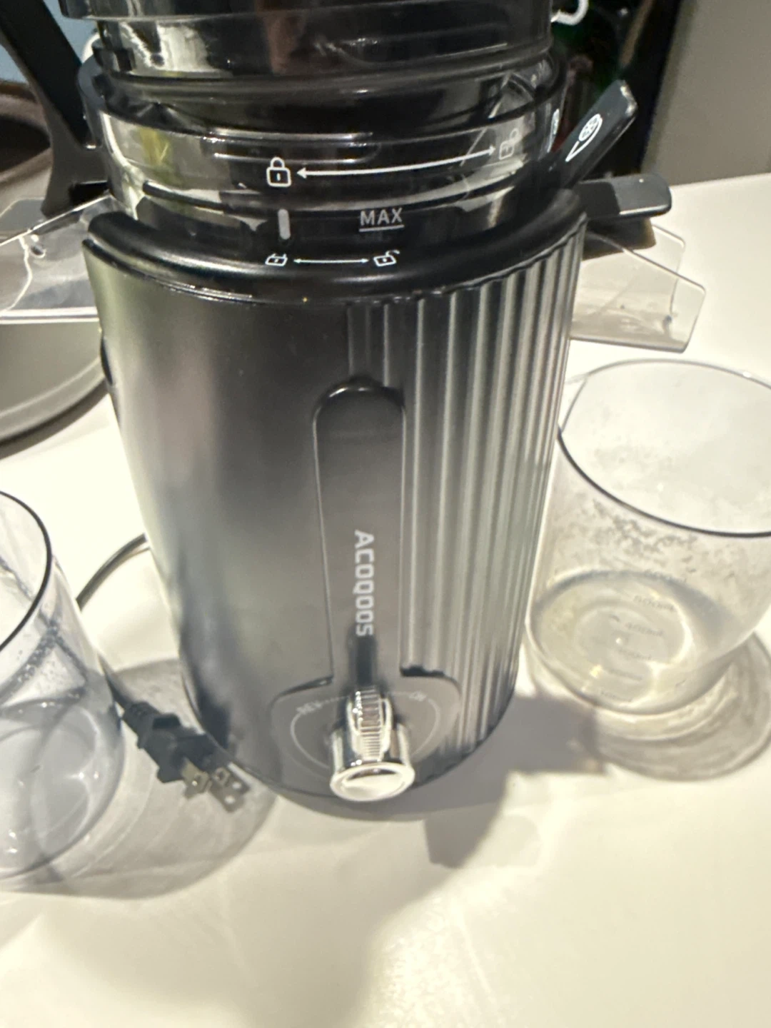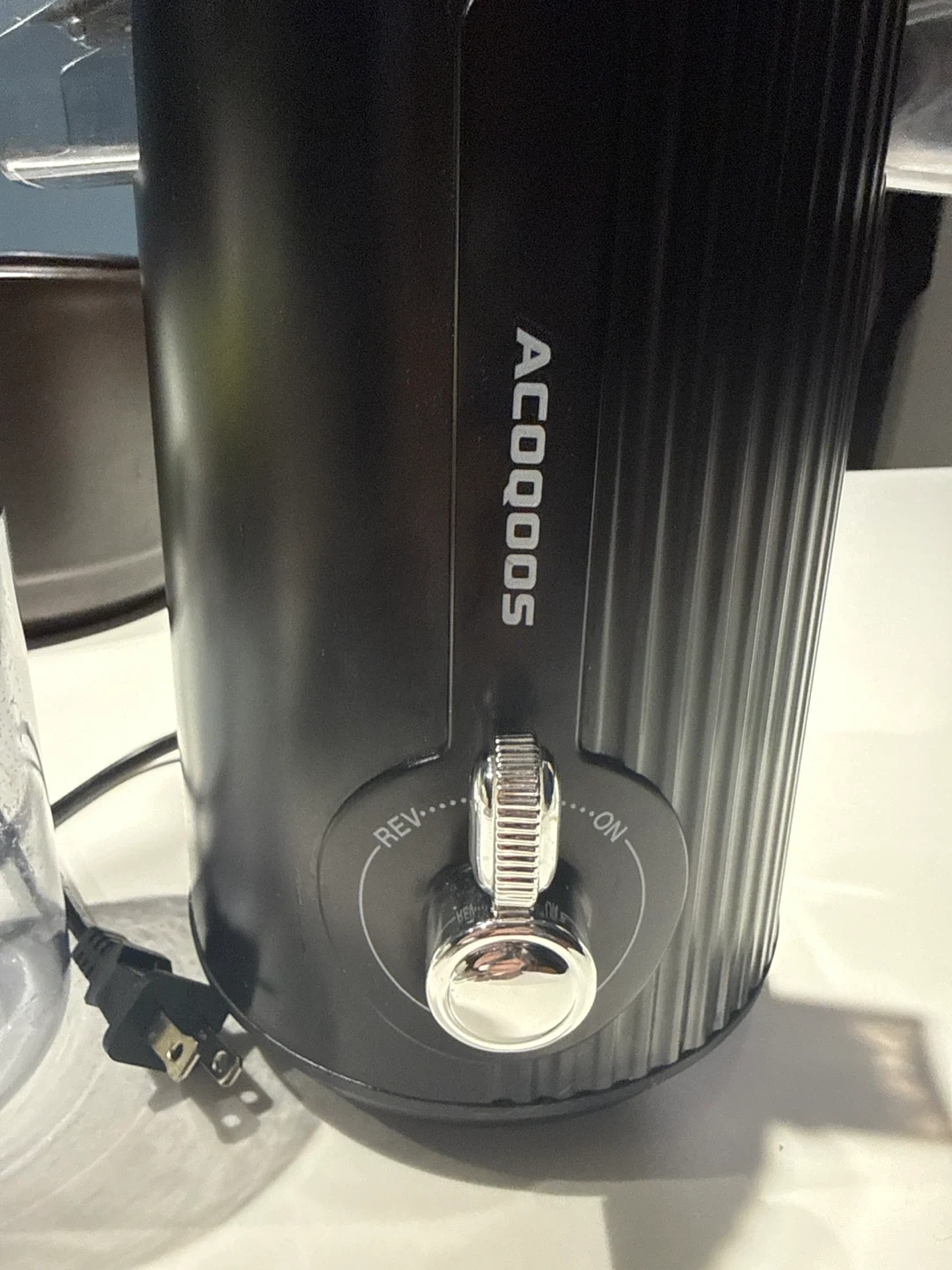 This is an ACOQOOS food processor. It has a powerful motor for chopping and blending. It's black and comes with two plastic containers.