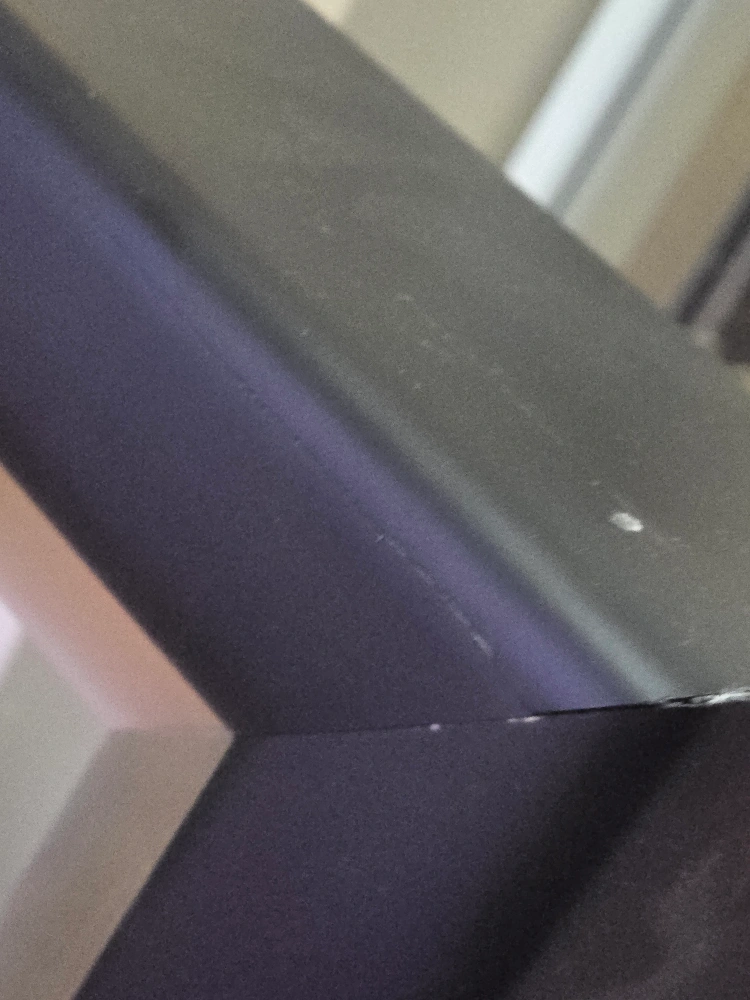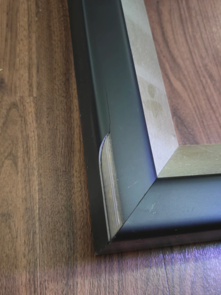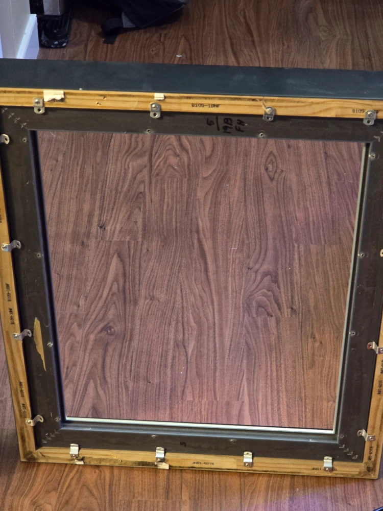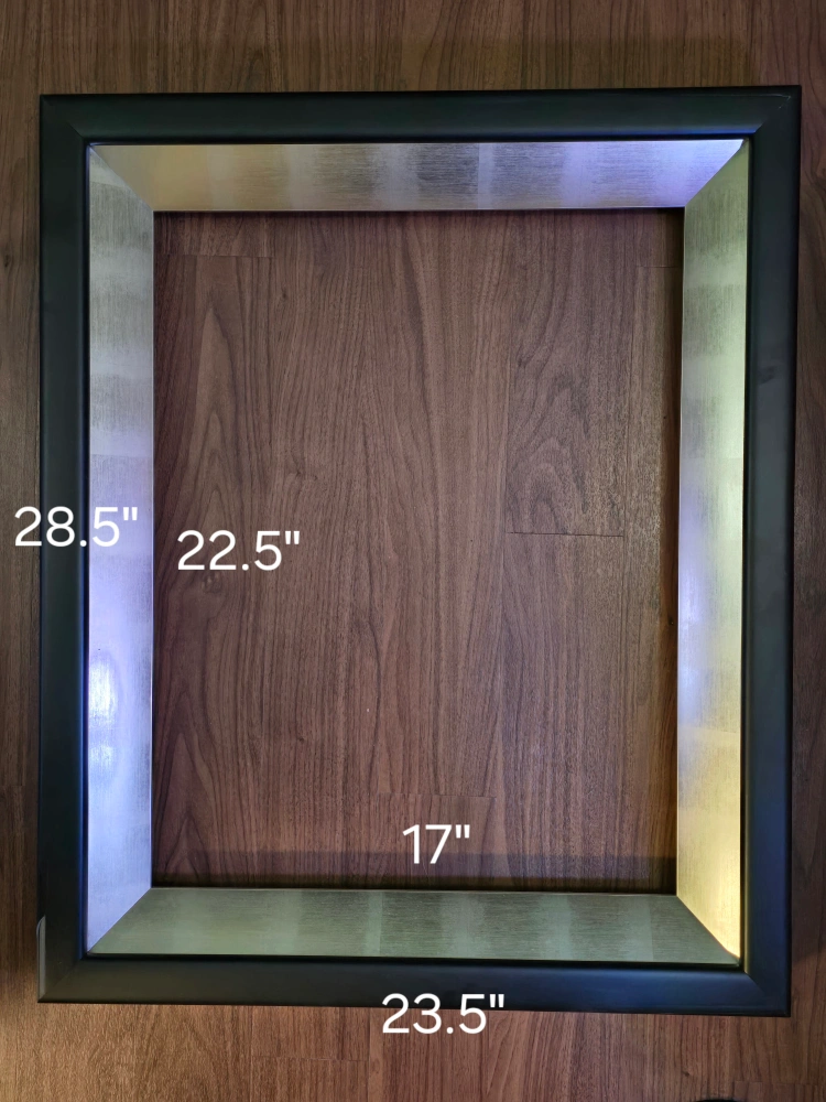Large black picture frame with a silver inner lip. Measures 28.5 inches by 23.5 inches on the outside and 17 inches by 22.5 inches on the inside. this is a solid frame however the veneer has cracked and chipped in some places an thus the low price.