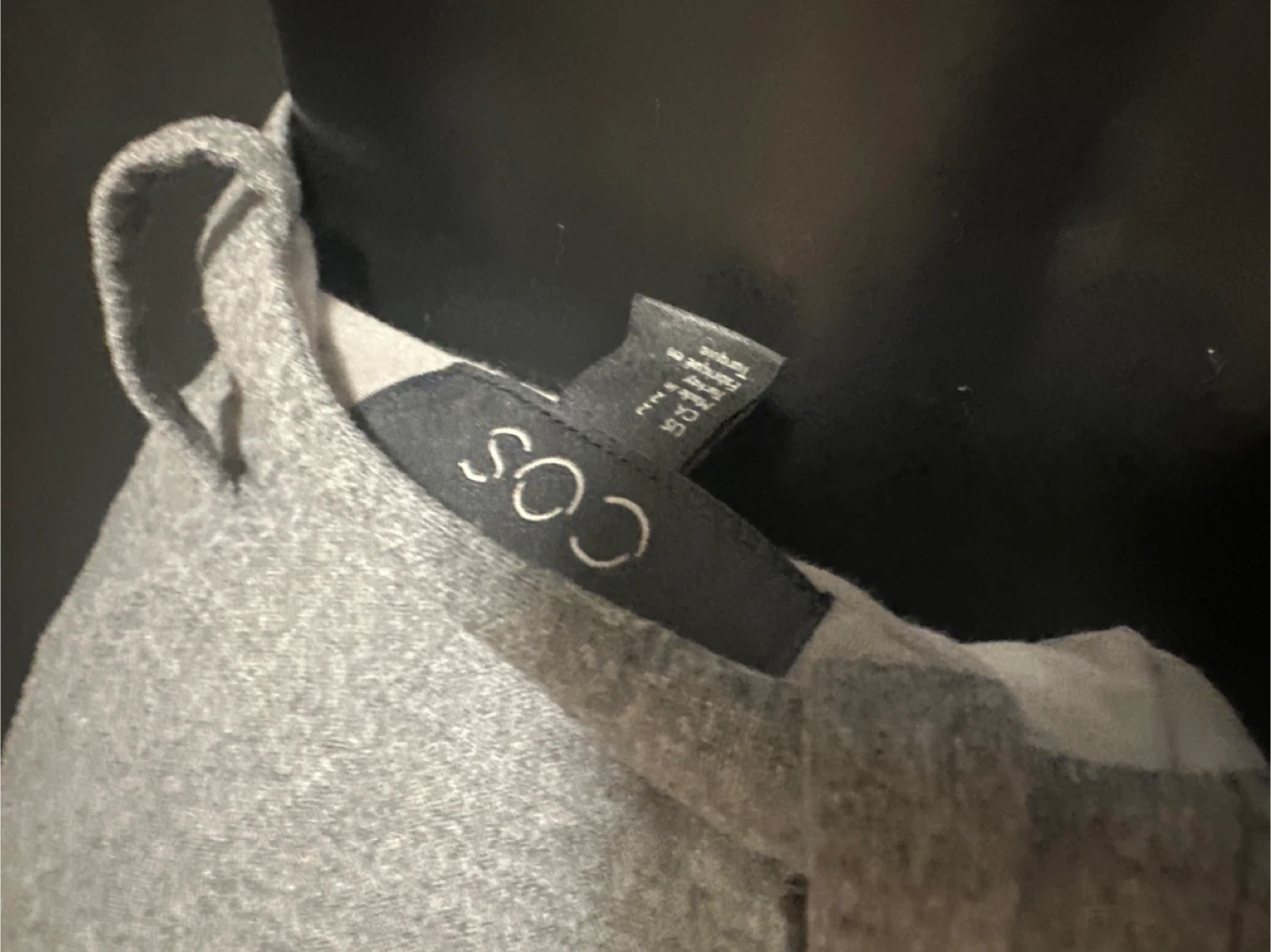 These COS trousers are a versatile grey color. They feature a classic pleated front and a straight leg fit. Made from a blend of polyester and viscose.