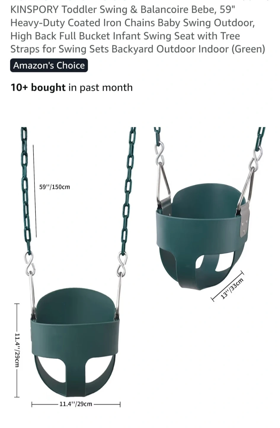 This is a KINSPORY toddler swing in green and stand set. The swing seat has a high back for support. It's designed for indoor or outdoor use. The stand is approximately 190cm tall and 113cm wide.