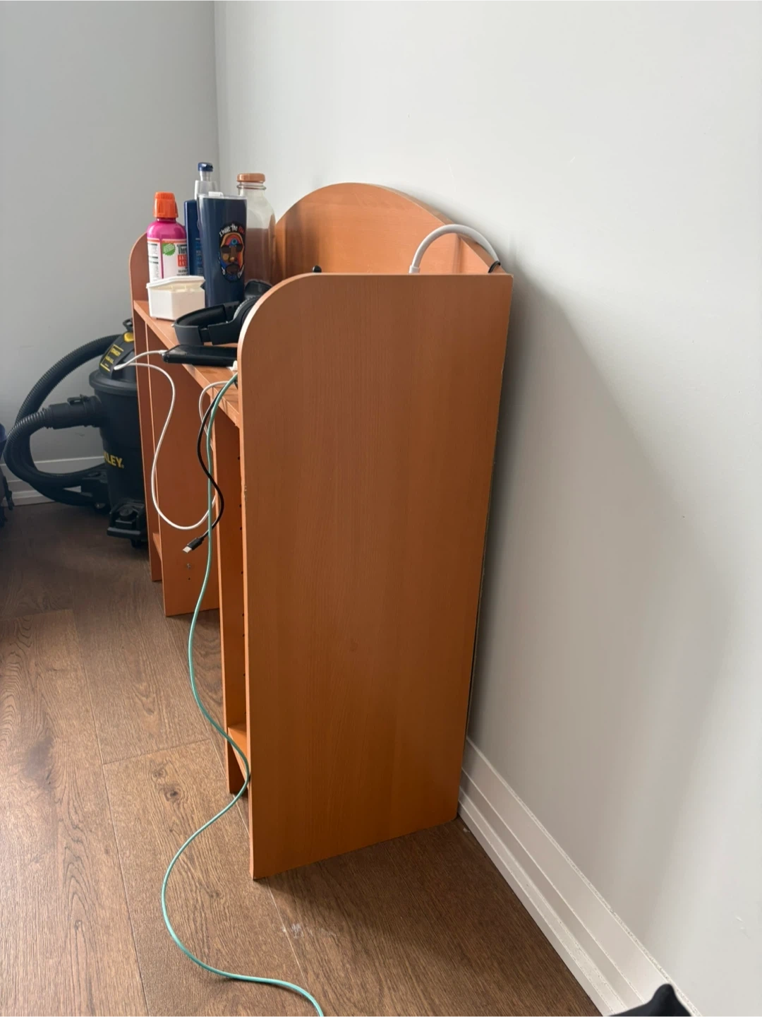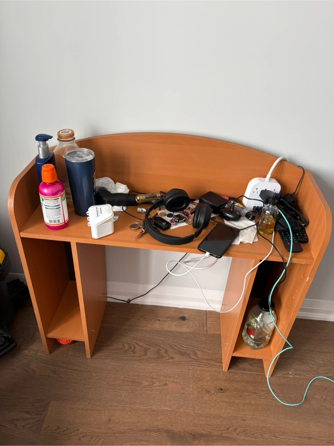 This is a compact wooden desk with two open shelving compartments. It's perfect for a small workspace or gaming setup. The desk has a curved top edge and a simple, functional design. Moving sale must pickup first come first serve. First come first served , make me a offer ready to move