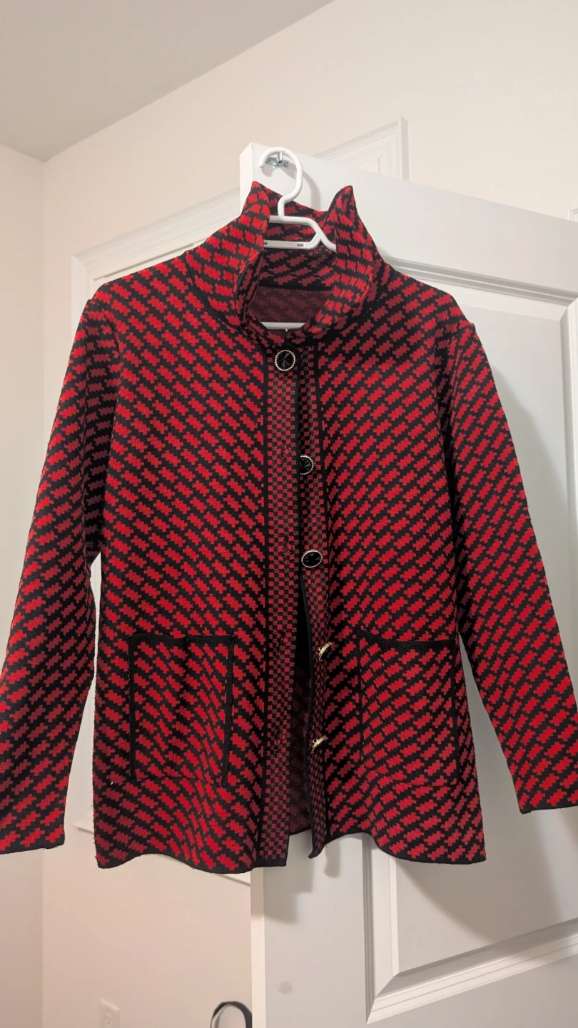 Here's a stylish button-up jacket with a unique red and black patterned design! It features a high collar and two front pockets. Perfect for adding a pop of colour to your wardrobe!
