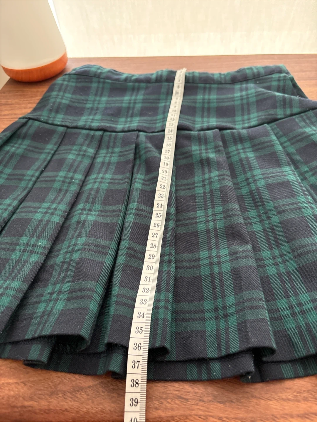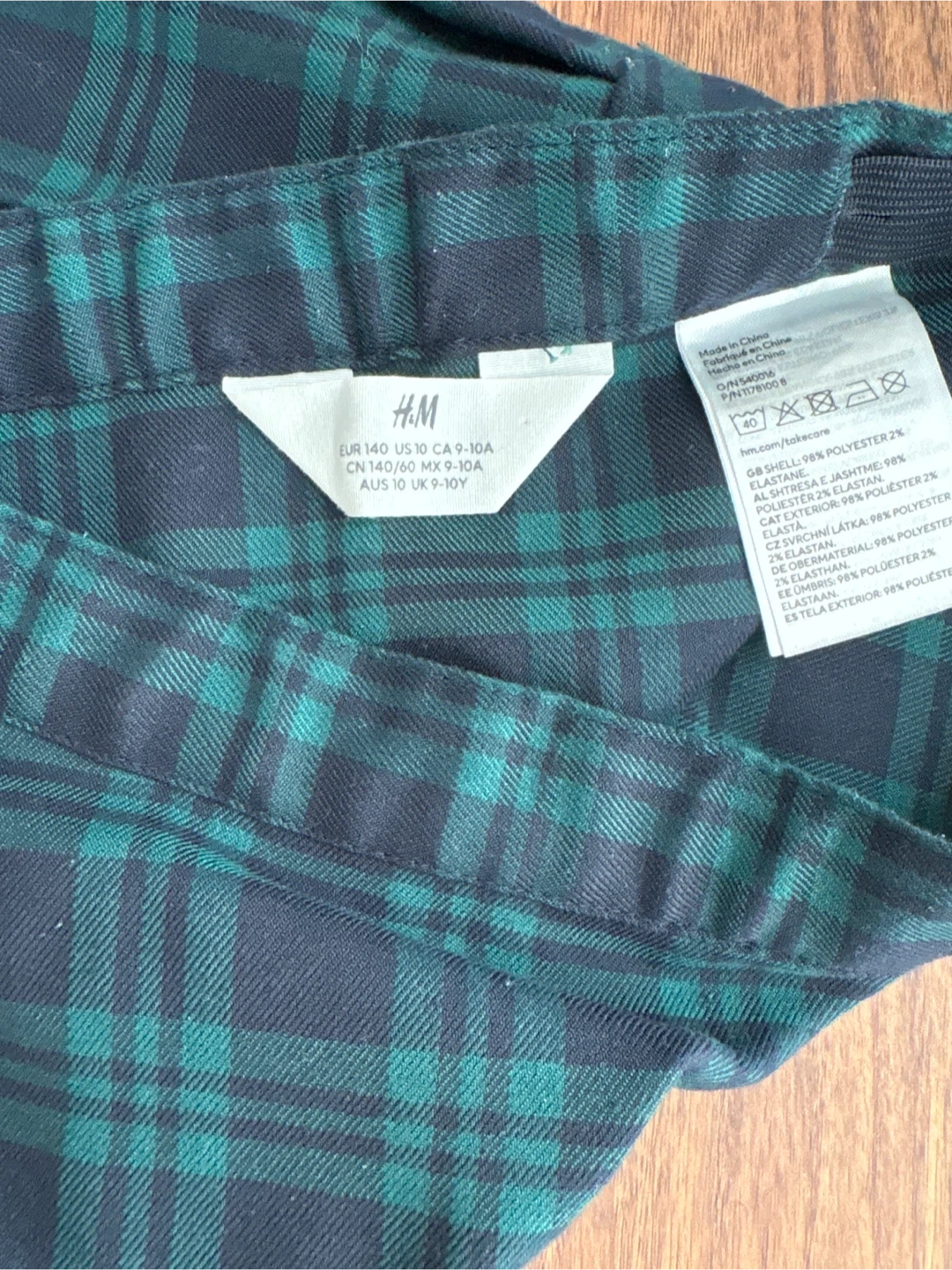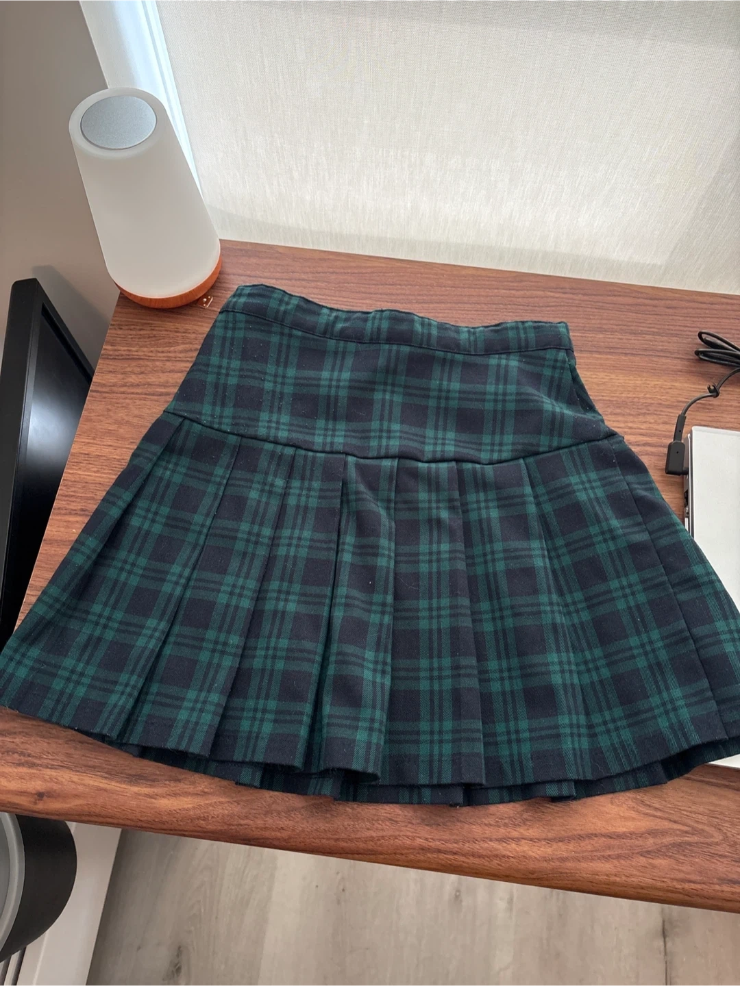 This H&M mini skirt features a classic green and navy plaid pattern with pleats. It's made of a polyester blend and has an elastic waistband. This skirt is perfect for summer wear or for a stylish school uniform look!