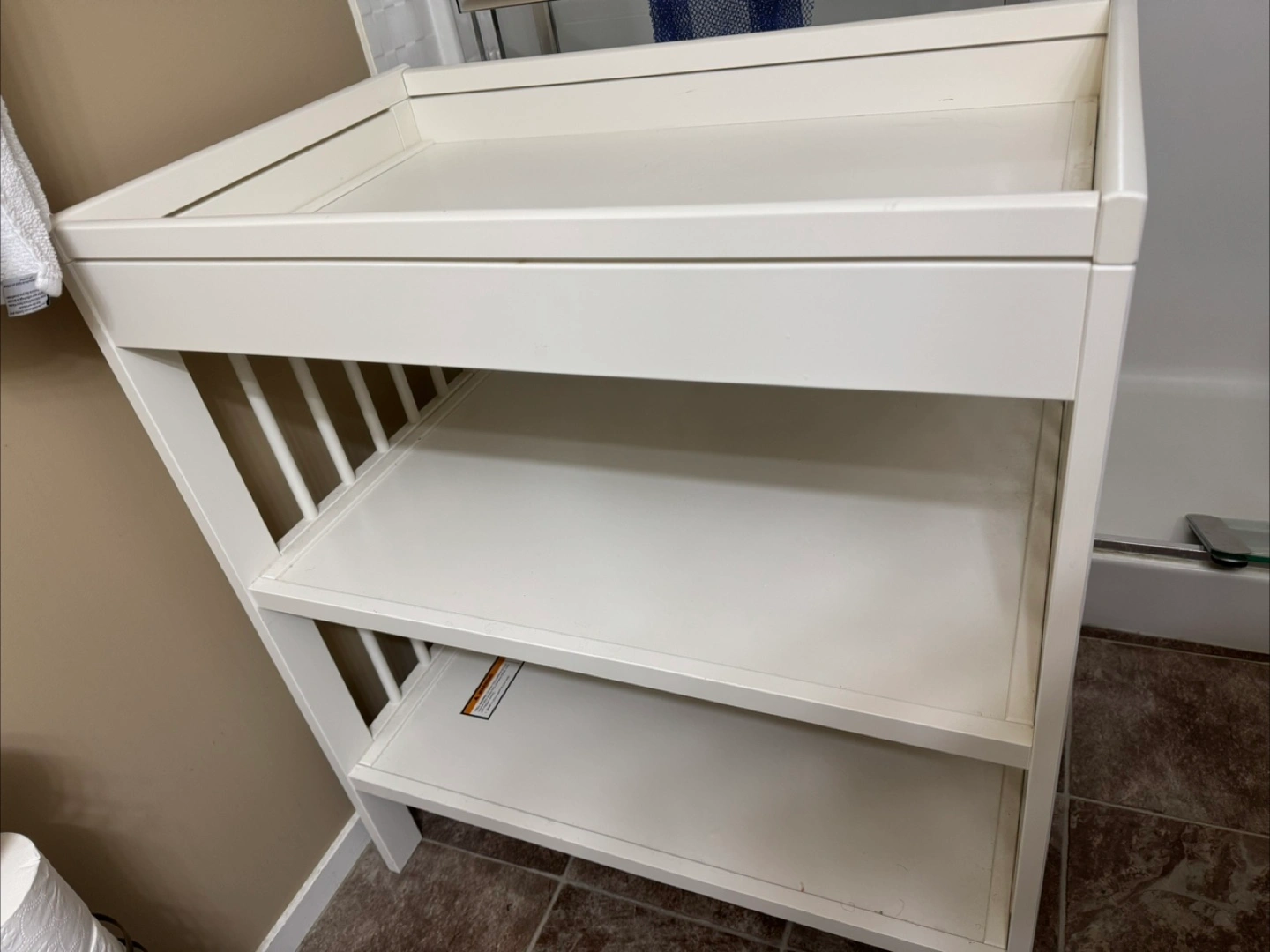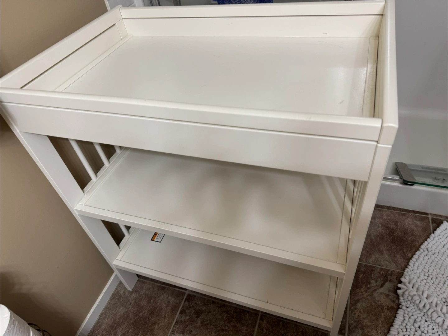 White changing table, three shelves. Good for baby supplies. No scratches or chipped paint.