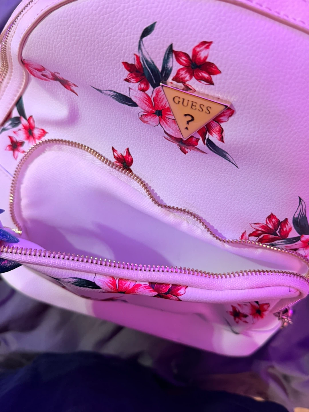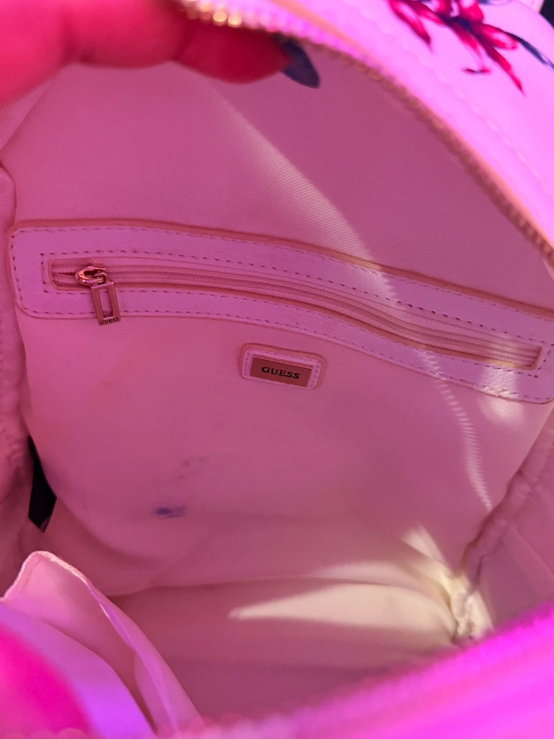 This is a cute Guess mini backpack with a floral print. It's in pretty good condition, with a very tiny stain on the inside. Perfect for carrying your essentials! It’s very spacious, it has a few pockets on the inside including a zipper pocket and another zipper pocket on the outside. Comes with Guess keychain. DM for offers.