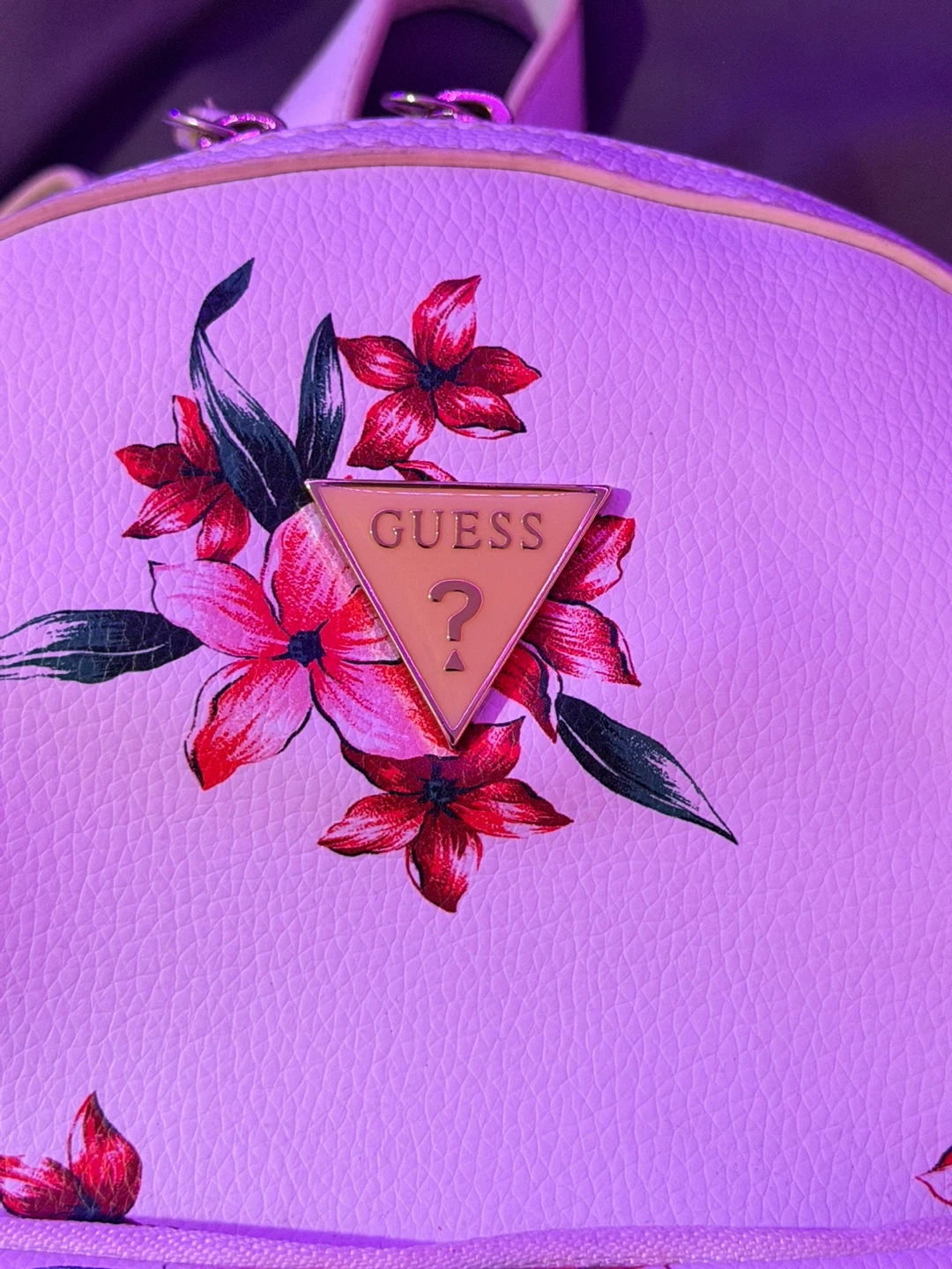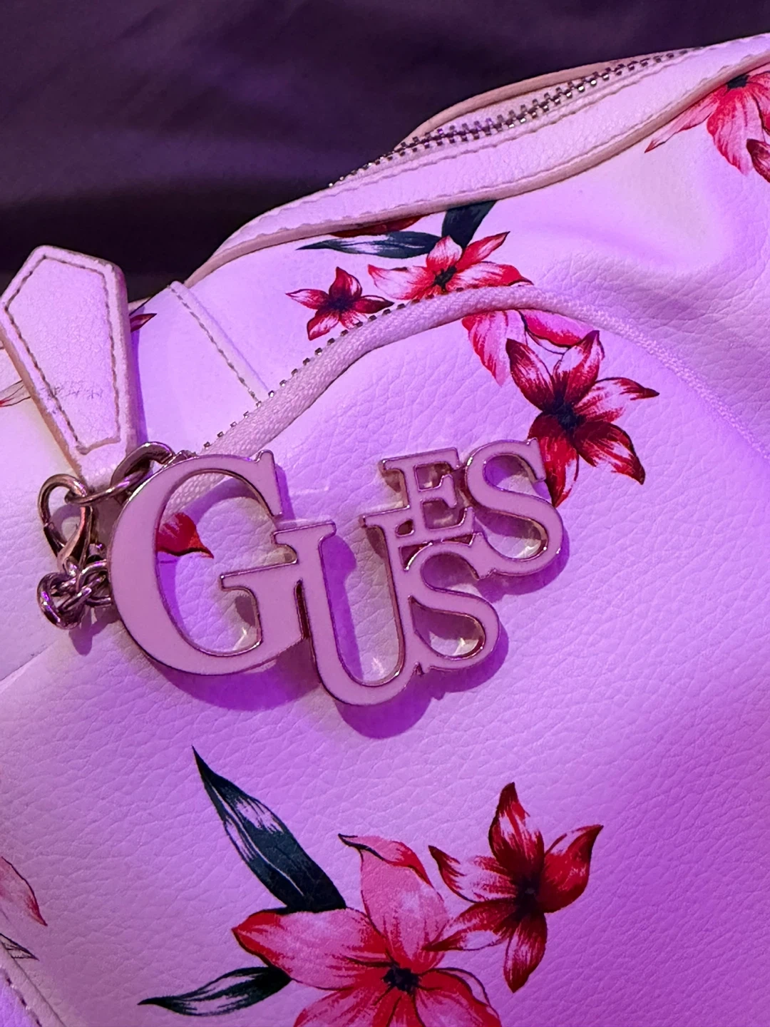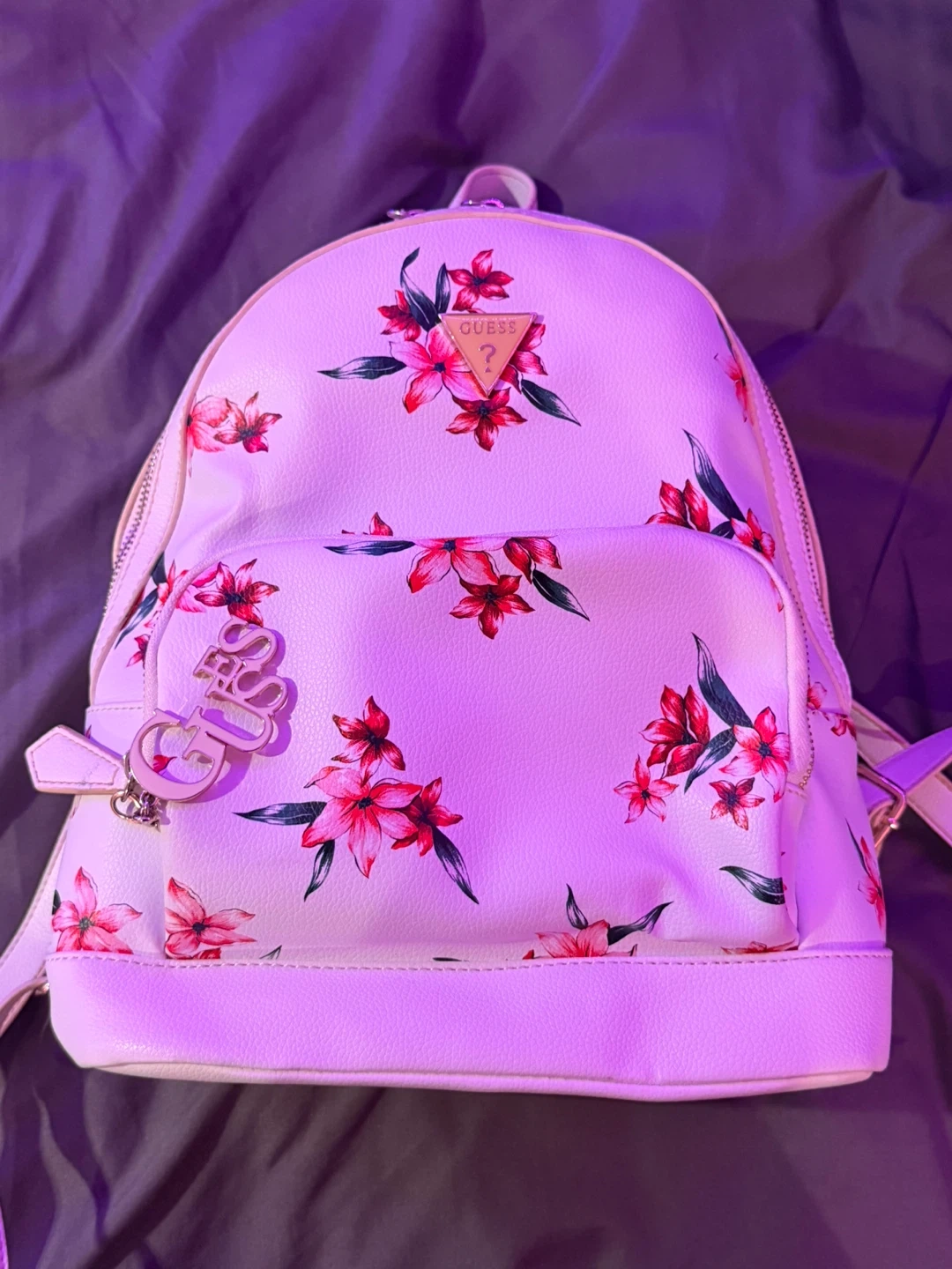 This is a cute Guess mini backpack with a floral print. It's in pretty good condition, with a very tiny stain on the inside. Perfect for carrying your essentials! It’s very spacious, it has a few pockets on the inside including a zipper pocket and another zipper pocket on the outside. Comes with Guess keychain. DM for offers.