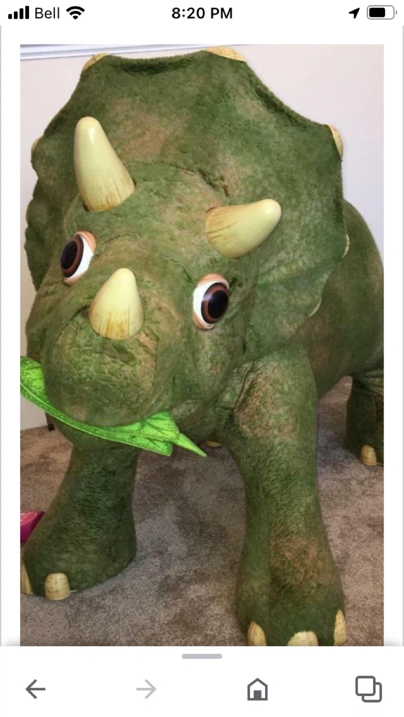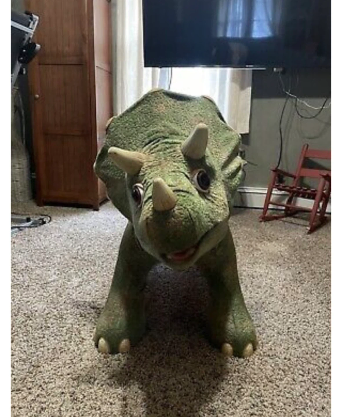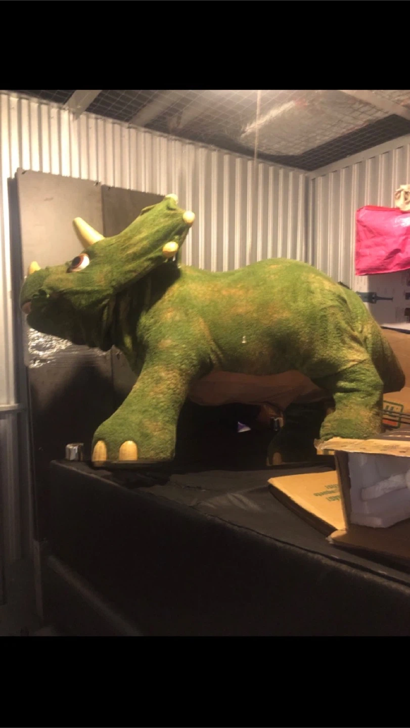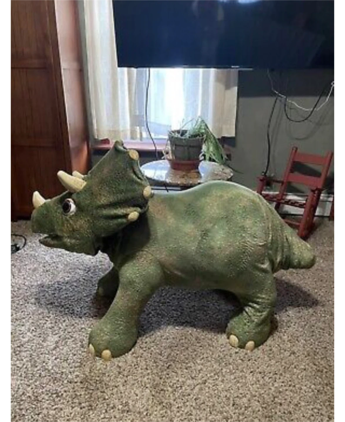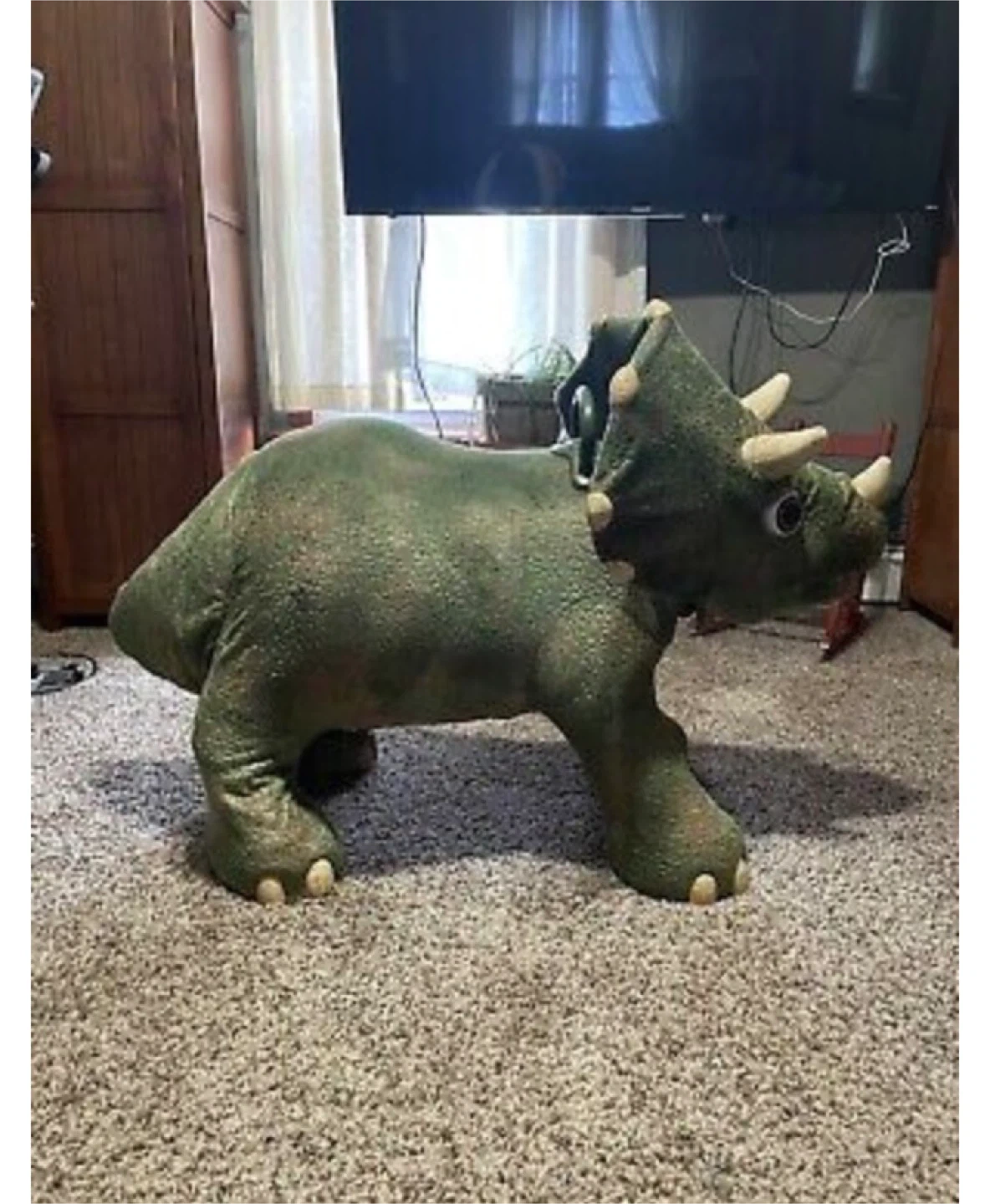 This is a large, triceratops ride-on toy. It's green with yellow accents on its horns and eyes. Its soft material makes it a fun companion for kids. It's great for imaginative play! It does take batteries it’s been a while since it’s been used I will be testing it out to see if it works. It will be a great collectible for somebody who likes dinosaurs. $350 if it doesn’t work $450 if it does work. This would be great for someone who loves collecting dinosaurs.
