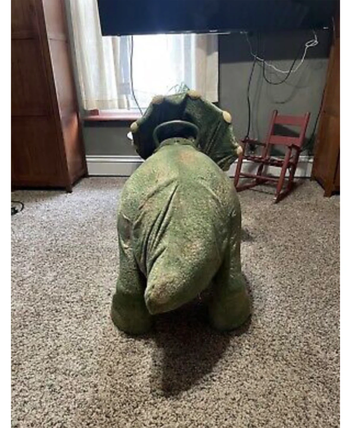 This is a large, triceratops ride-on toy. It's green with yellow accents on its horns and eyes. Its soft material makes it a fun companion for kids. It's great for imaginative play! It does take batteries it’s been a while since it’s been used I will be testing it out to see if it works. It will be a great collectible for somebody who likes dinosaurs. $350 if it doesn’t work $450 if it does work. This would be great for someone who loves collecting dinosaurs.