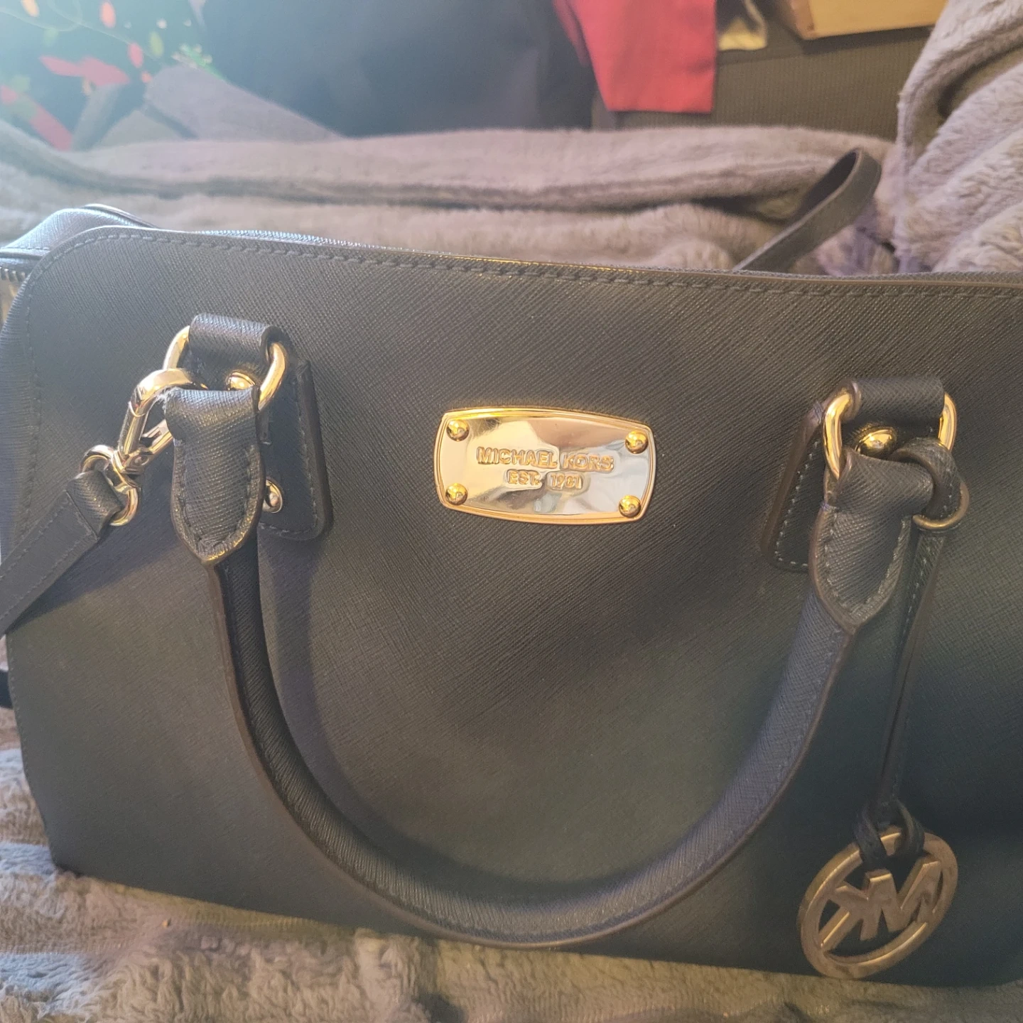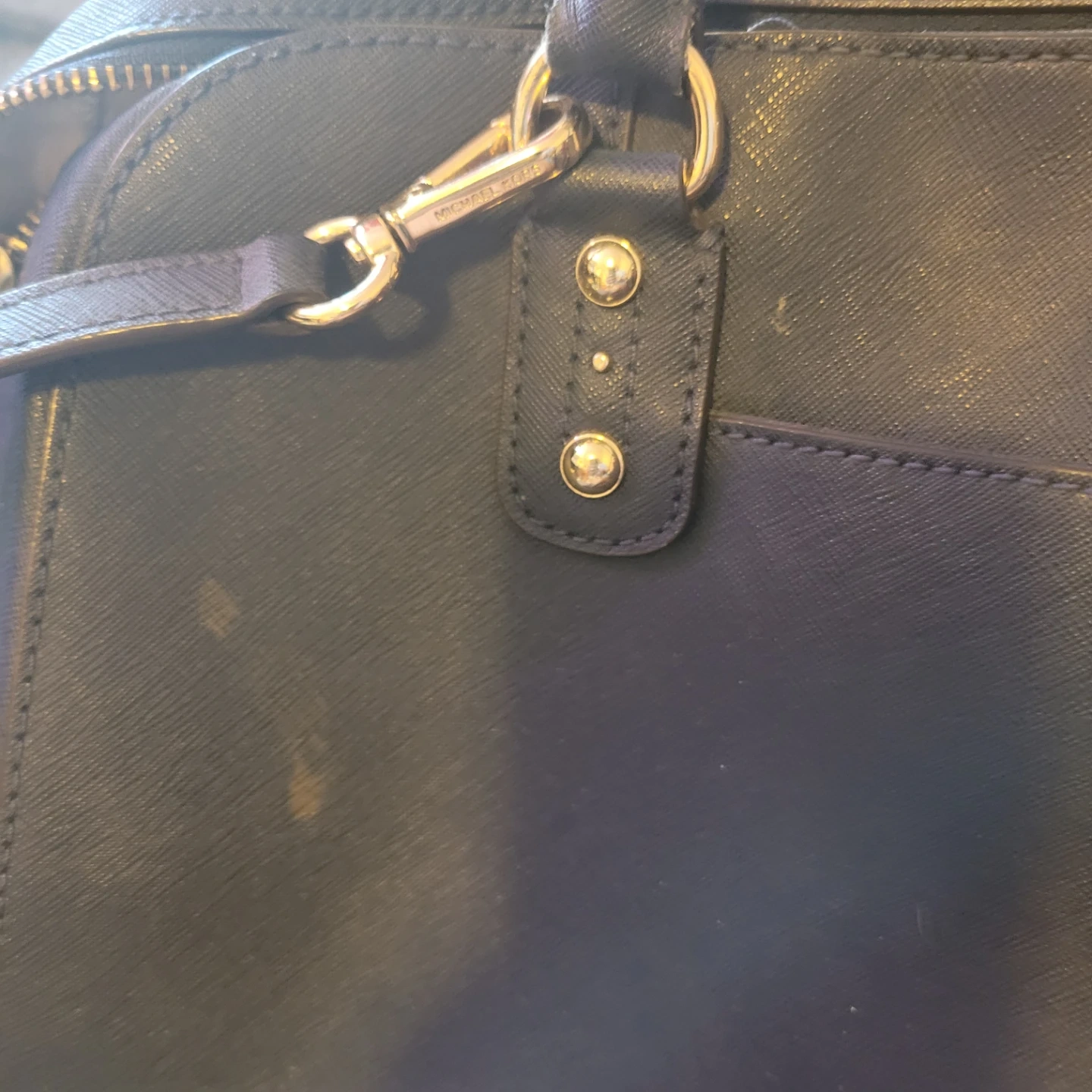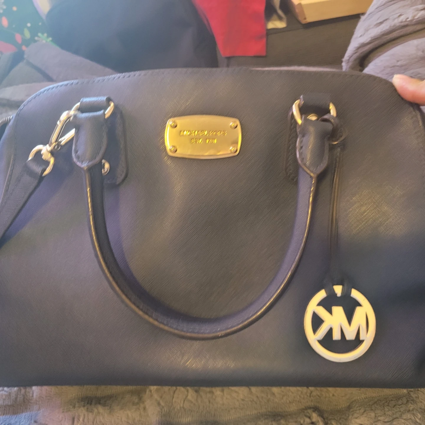 This is a navy blue Michael Kors satchel handbag. It's made of leather and features gold-tone hardware. It's a classic style that can be used for everyday wear.