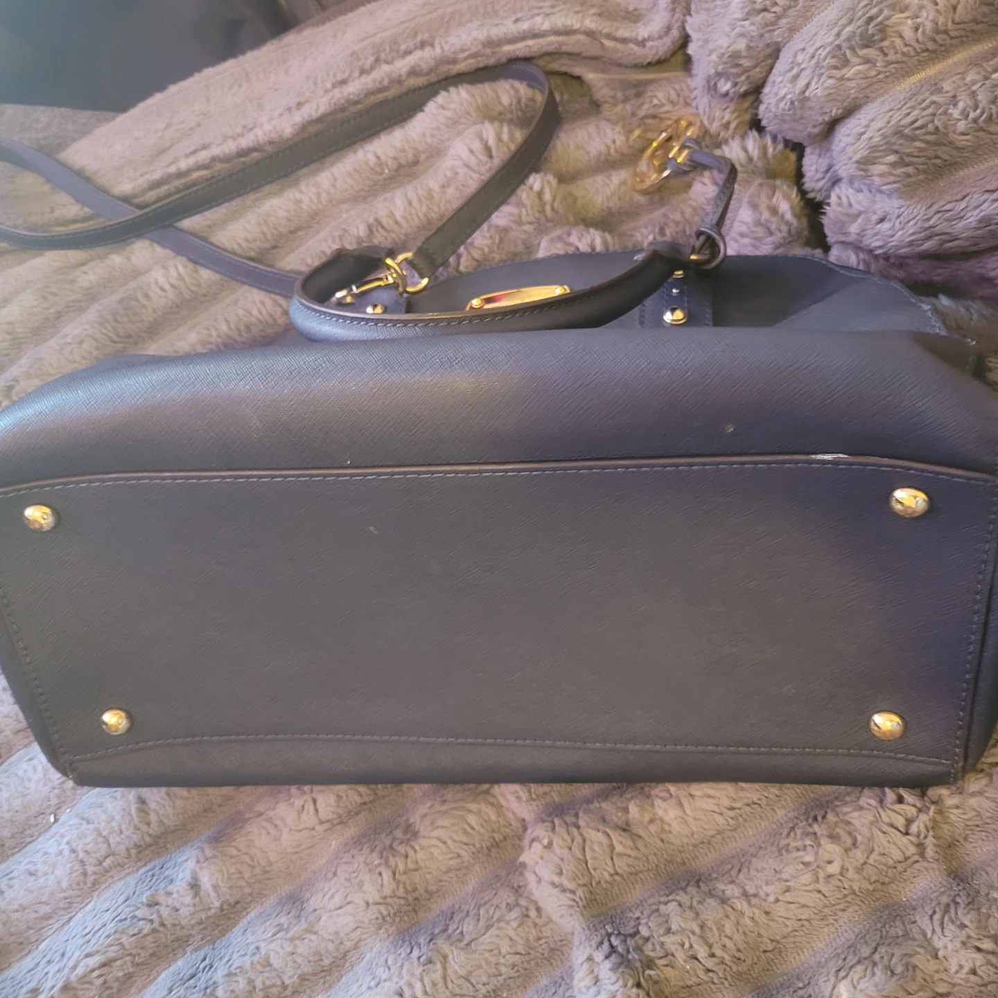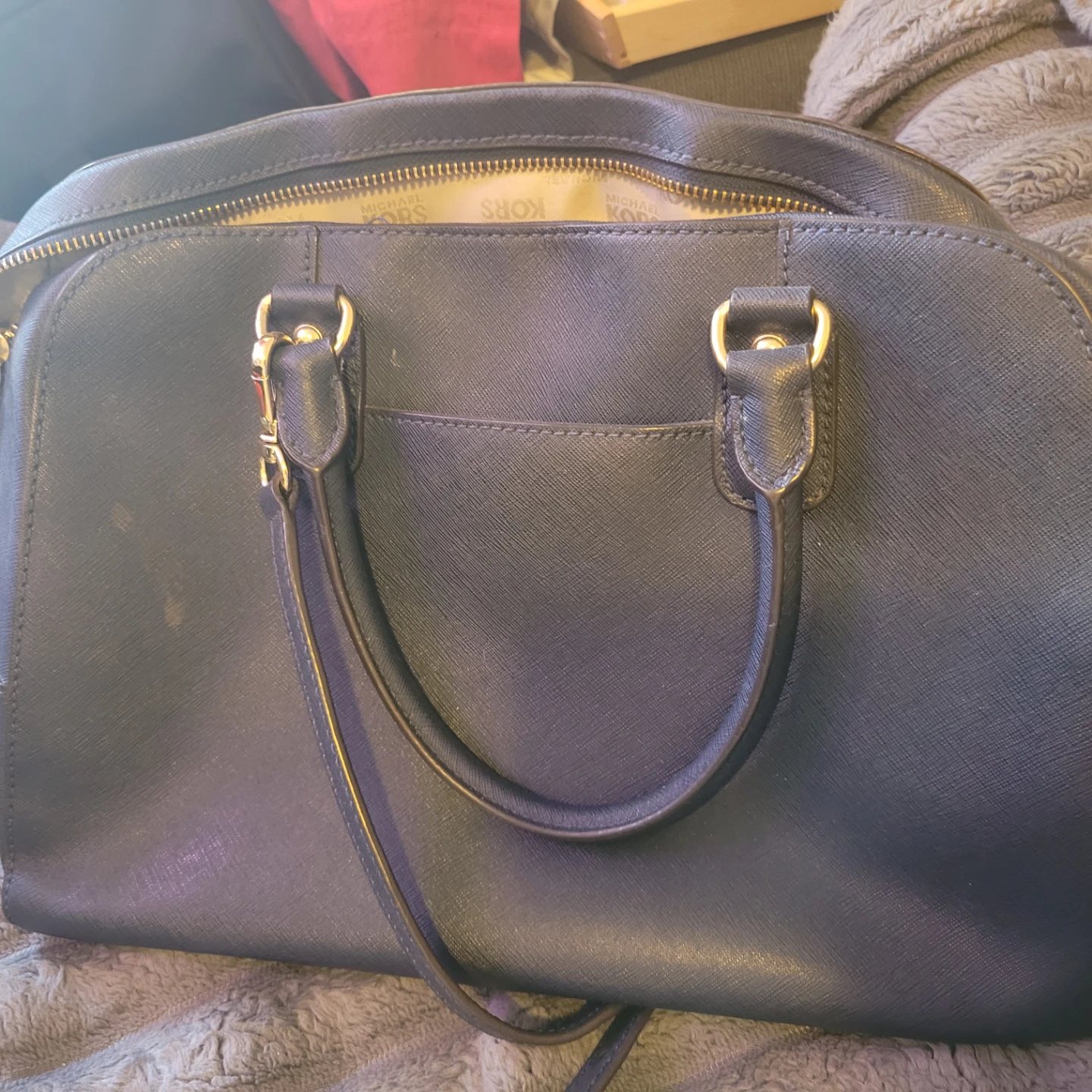This is a navy blue Michael Kors satchel handbag. It's made of leather and features gold-tone hardware. It's a classic style that can be used for everyday wear.