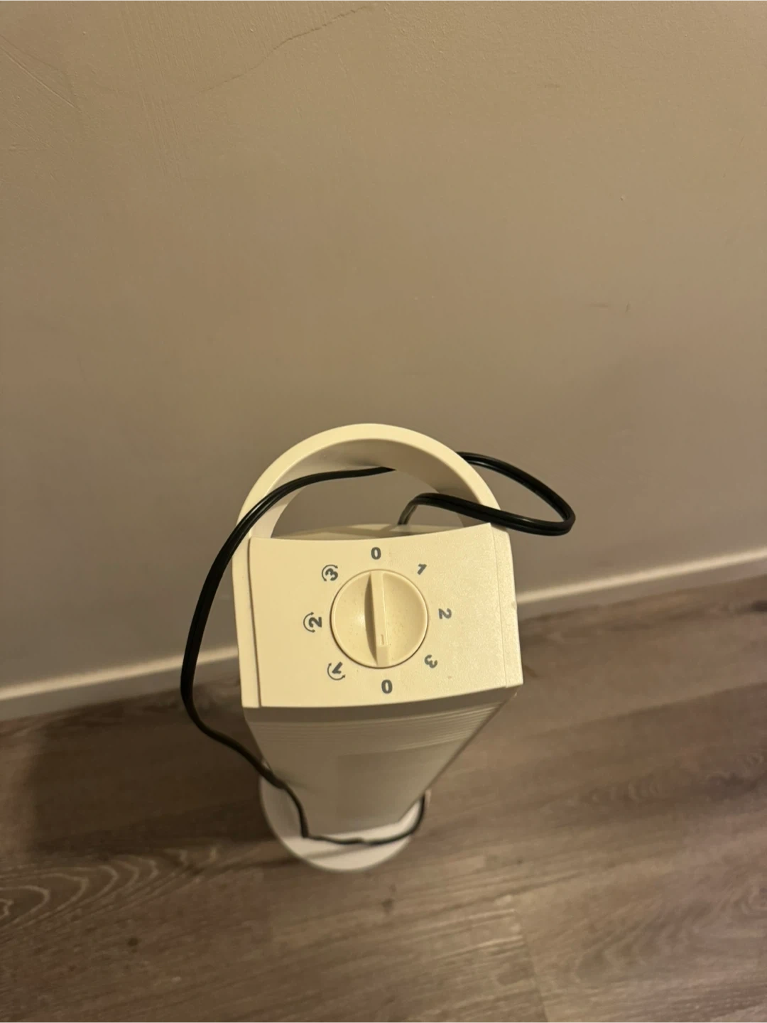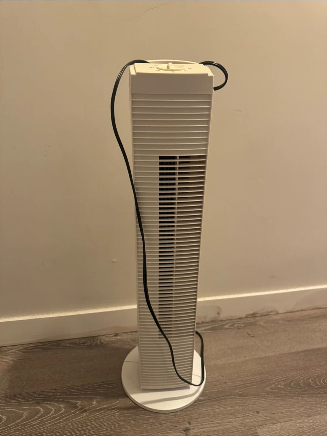 Selling a white tower fan. It has a simple design and is easy to use with a dial to control the fan speed. Perfect for cooling down a small room or office space during the warmer months