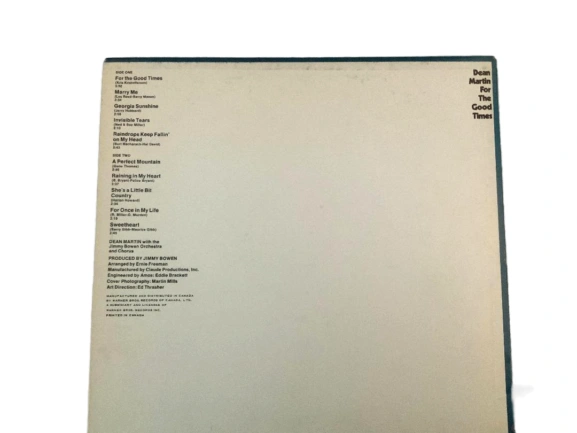 Dean Martin's 'For The Good Times' vinyl record. Includes tracks like 'For The Good Times', 'Marry Me', and 'Georgia Sunshine'. Arranged by Ernie Freeman and produced by Jimmy Bowen.
