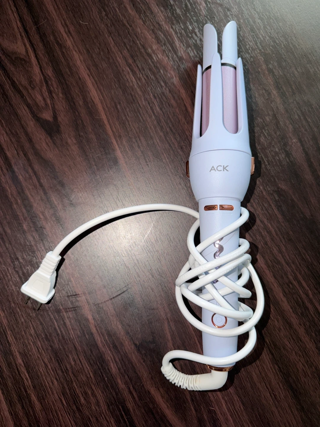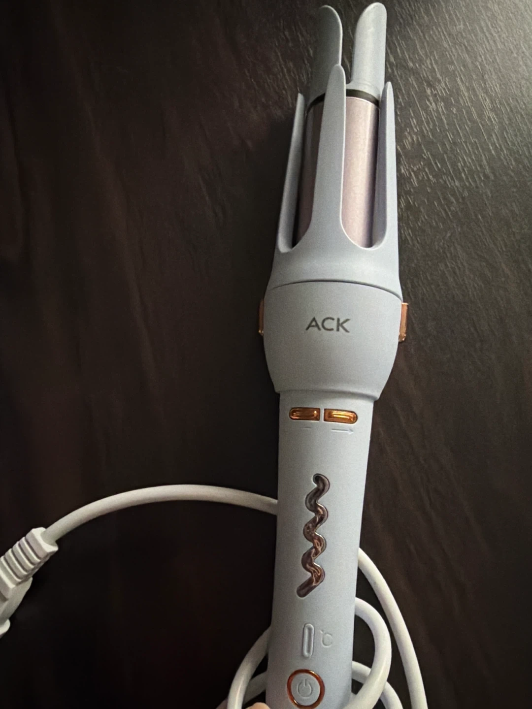 This is an ACK automatic hair curler in a light purple colour. It features an easy-to-use curling chamber. Corded electric hair styling tool.