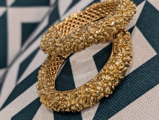 Elevate your style with our gorgeous collection of imitation gold bangles—crafted in bold statement designs, delicate patterns, classic gold finishes, and stone-studded accents. Whether paired with Indian outfits or western wear, these bangles bring the perfect blend of tradition and modern elegance. With Diwali around the corner, they make a beautiful gift for loved ones—without breaking the bank. You can grab these for just $30/pair. Limited stock available! Pick-up at QEW & Mississauga Road. Don’t miss out!