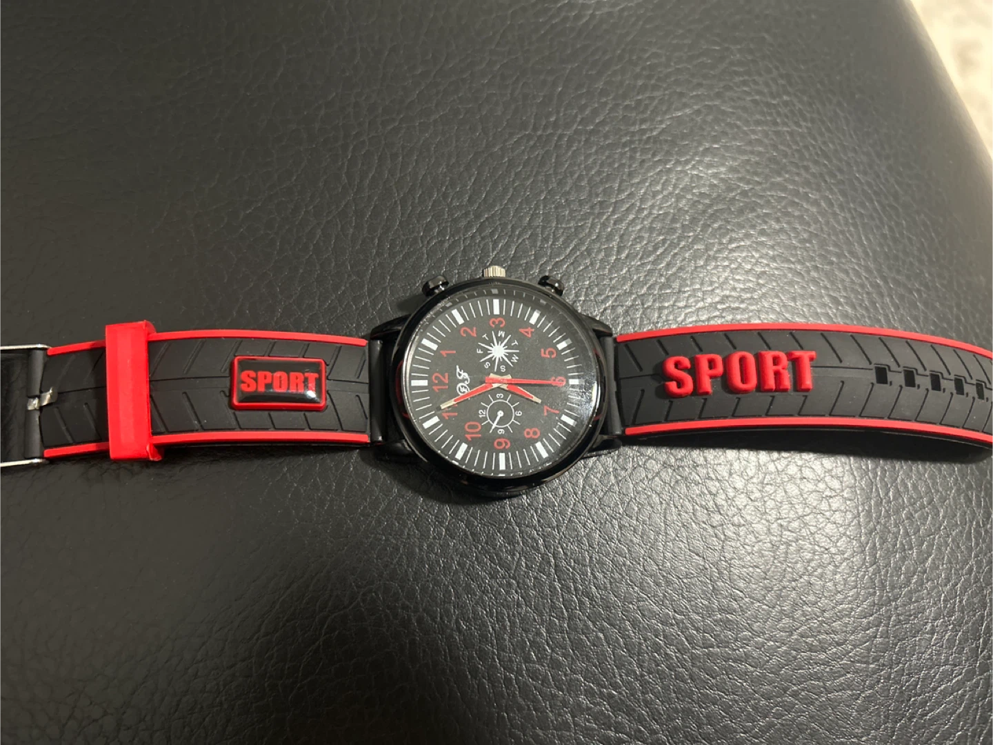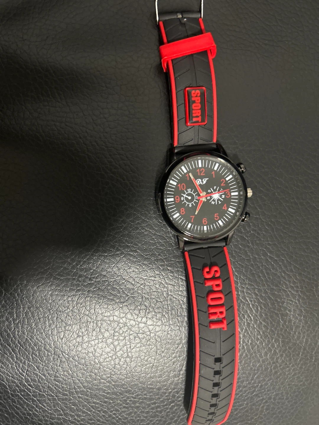 This black watch features a sporty design with red accents on the band and dial. The strap is made of durable silicone and has 'SPORT' embossed on it. It's a great accessory for active individuals. Includes standard time display.