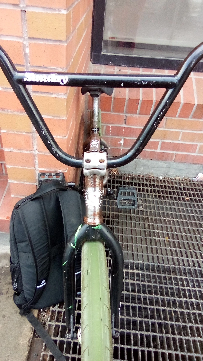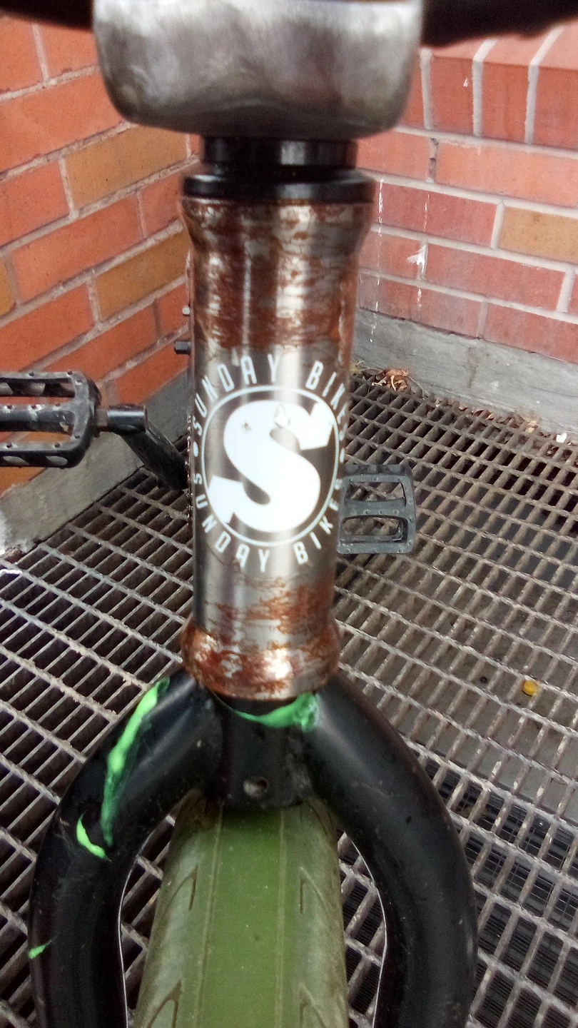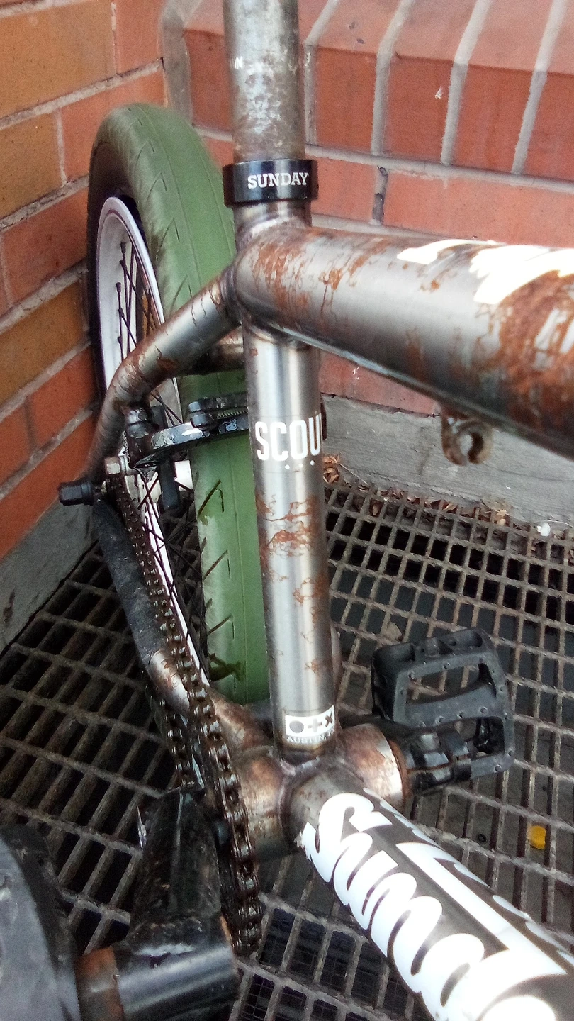 Used Sunday Scout BMX 2021 bike. Features green tires and a black seat.all original except for handle grips and seat but the seat is better than the original the original color is all Chrome the rust can become quite confident I think it adds a nice routine look to it there are some extra added stickers that did not come with it it can be removed but other than that it's a great bike rides incredible all original like I said the rest can be wiped off but I think it has a nice look to it the listing online brand new is 1499. I plan to shine it up but if you like the rustique look as much as I do then let me know