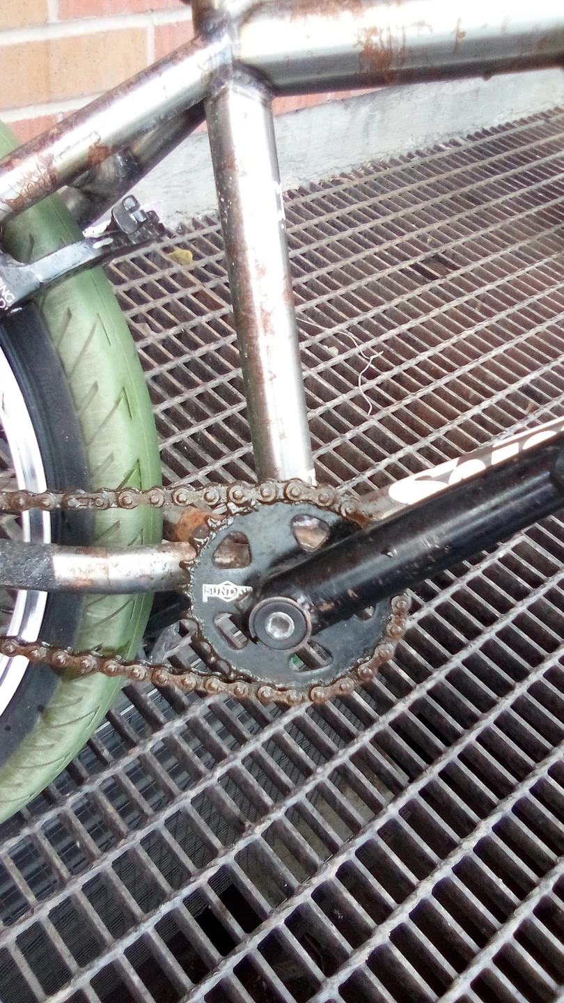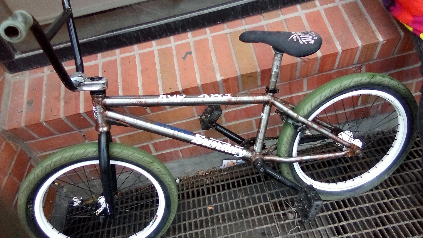Used Sunday Scout BMX 2021 bike. Features green tires and a black seat.all original except for handle grips and seat but the seat is better than the original the original color is all Chrome the rust can become quite confident I think it adds a nice routine look to it there are some extra added stickers that did not come with it it can be removed but other than that it's a great bike rides incredible all original like I said the rest can be wiped off but I think it has a nice look to it the listing online brand new is 1499. I plan to shine it up but if you like the rustique look as much as I do then let me know