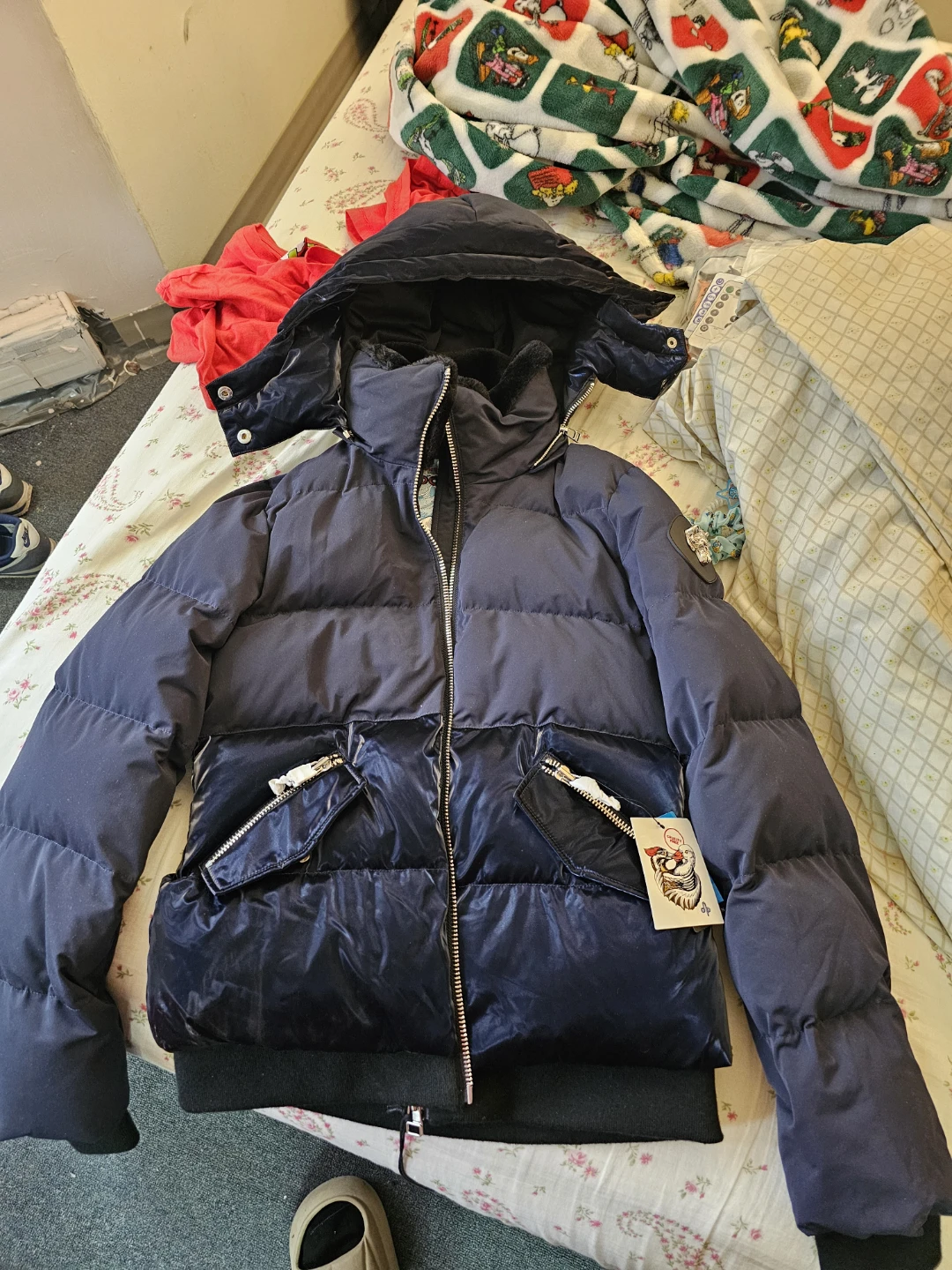 Selling a stylish Woodpecker winter coat in navy. It's in great condition and perfect for staying warm during the cold Canadian winters! This coat features a hood, a front zipper closure, and a unique logo on the sleeve. It’s a beautiful and functional piece!