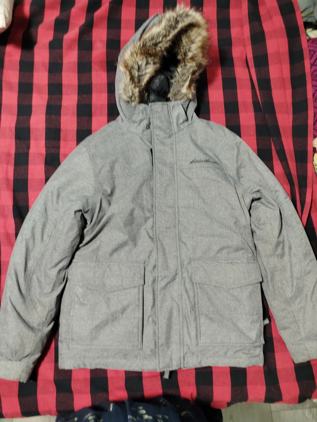 Stay warm this winter with an Eddie Bauer parka! It's a stylish grey colour and features a faux fur-trimmed hood. Minimally used, has adjustment straps in the hood, velcro apart from jacket zip. Similarly the fur could be removed for wash.Mens size S