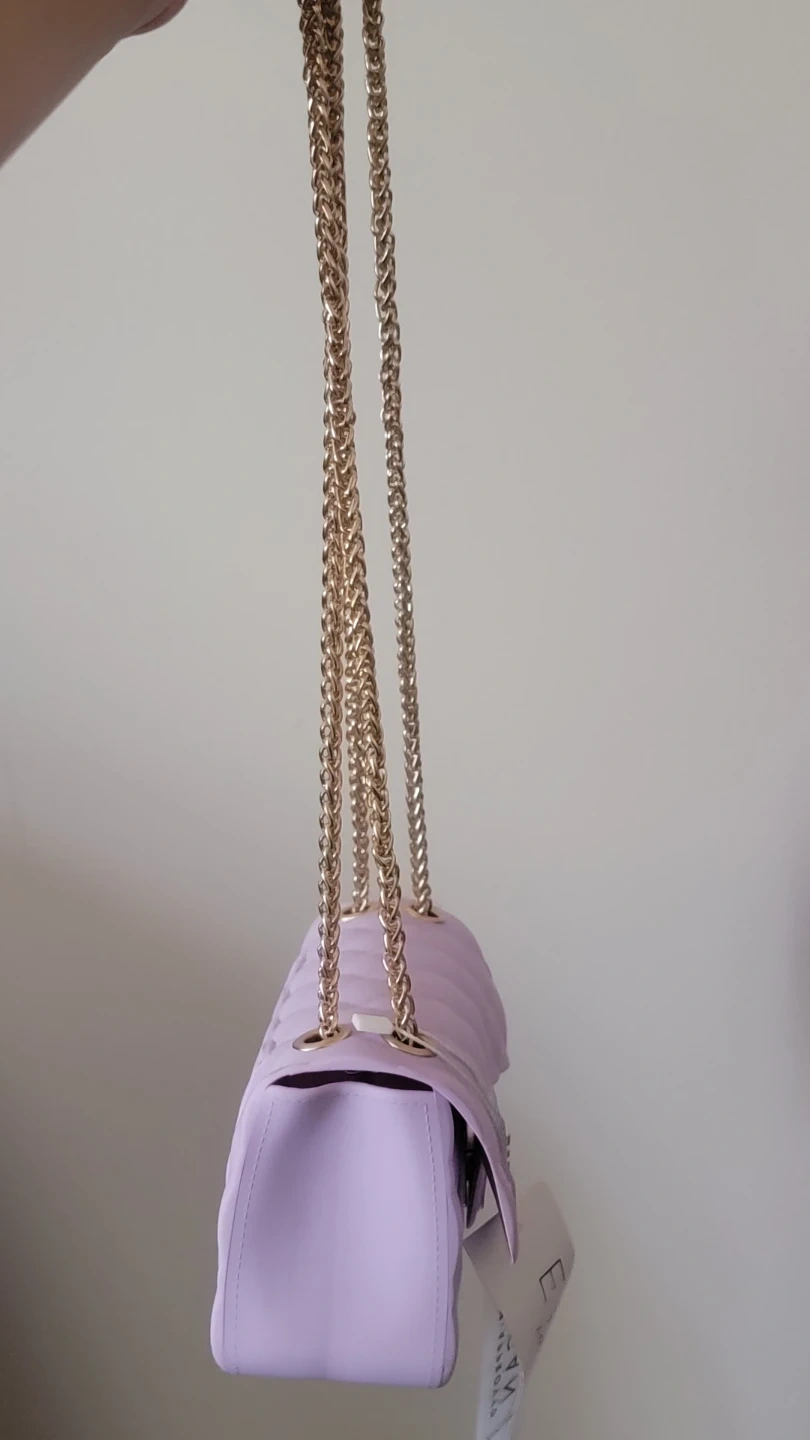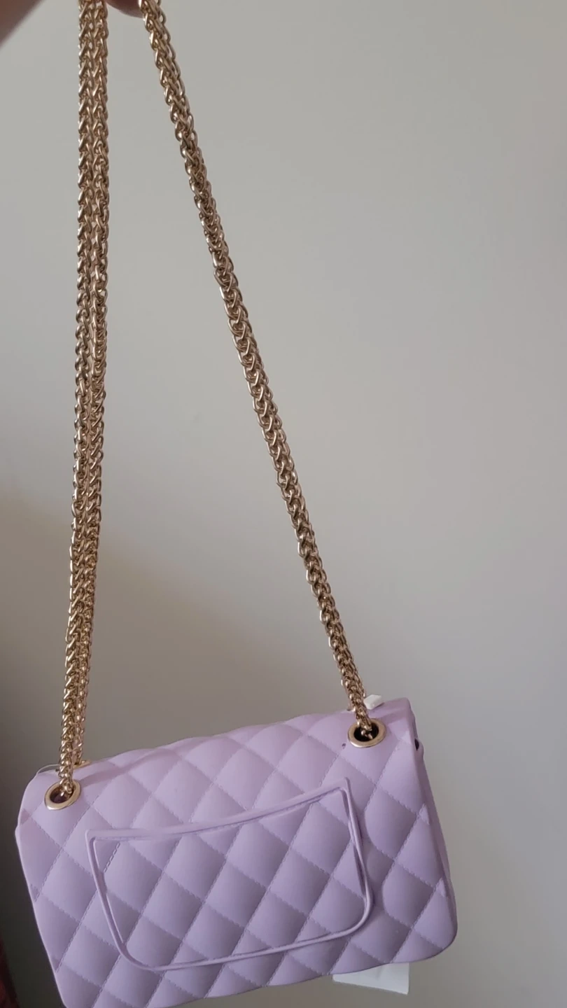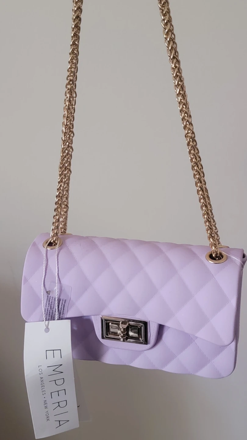 This Emperia handbag is a stylish lavender colour and made from jelly material. It has a quilted design with a gold chain strap and a secure clasp closure. It's perfect for adding a pop of colour to any outfit!