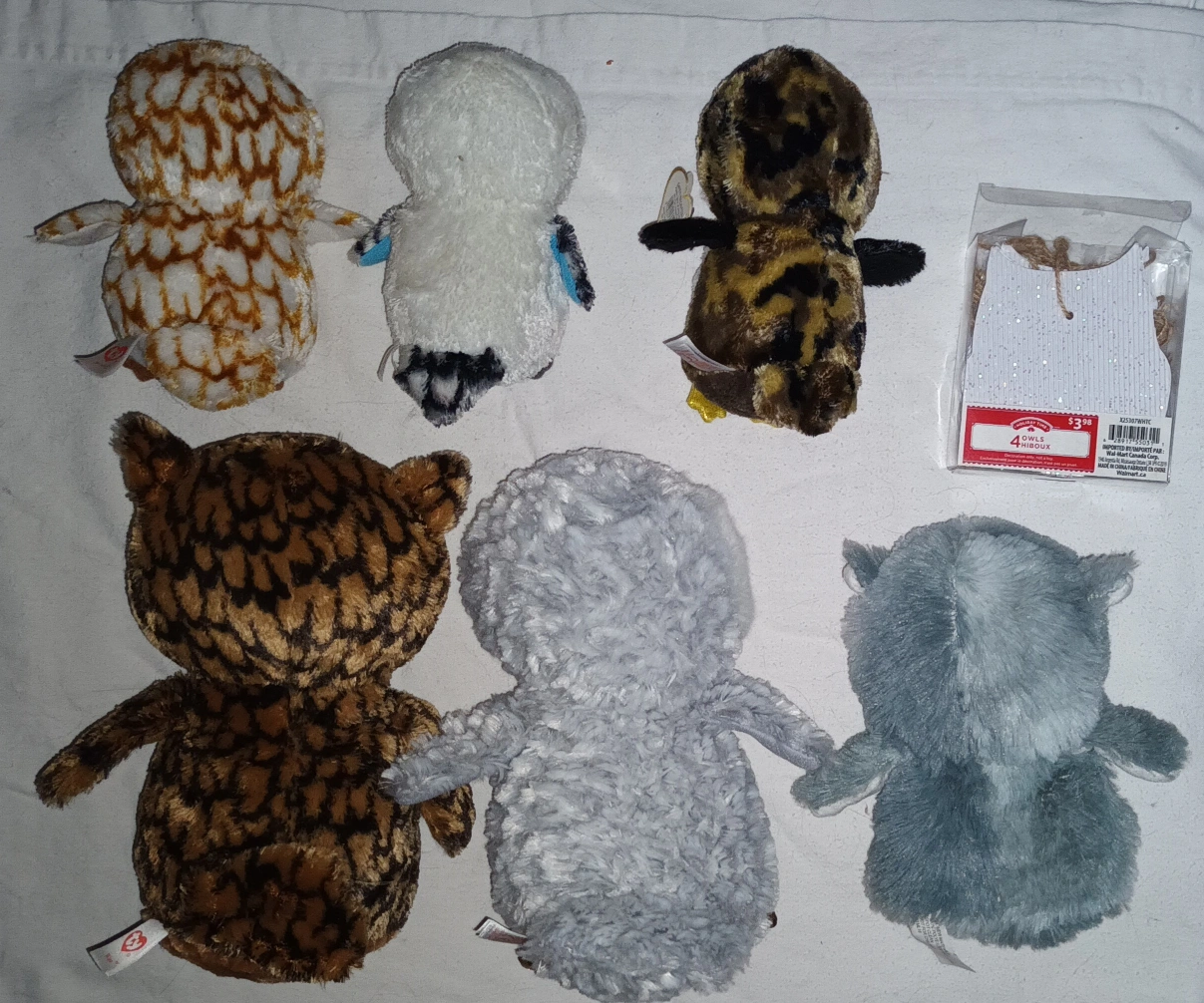 Plush owls. Various colours and patterns. Great for collectors or kids and 4 ornaments