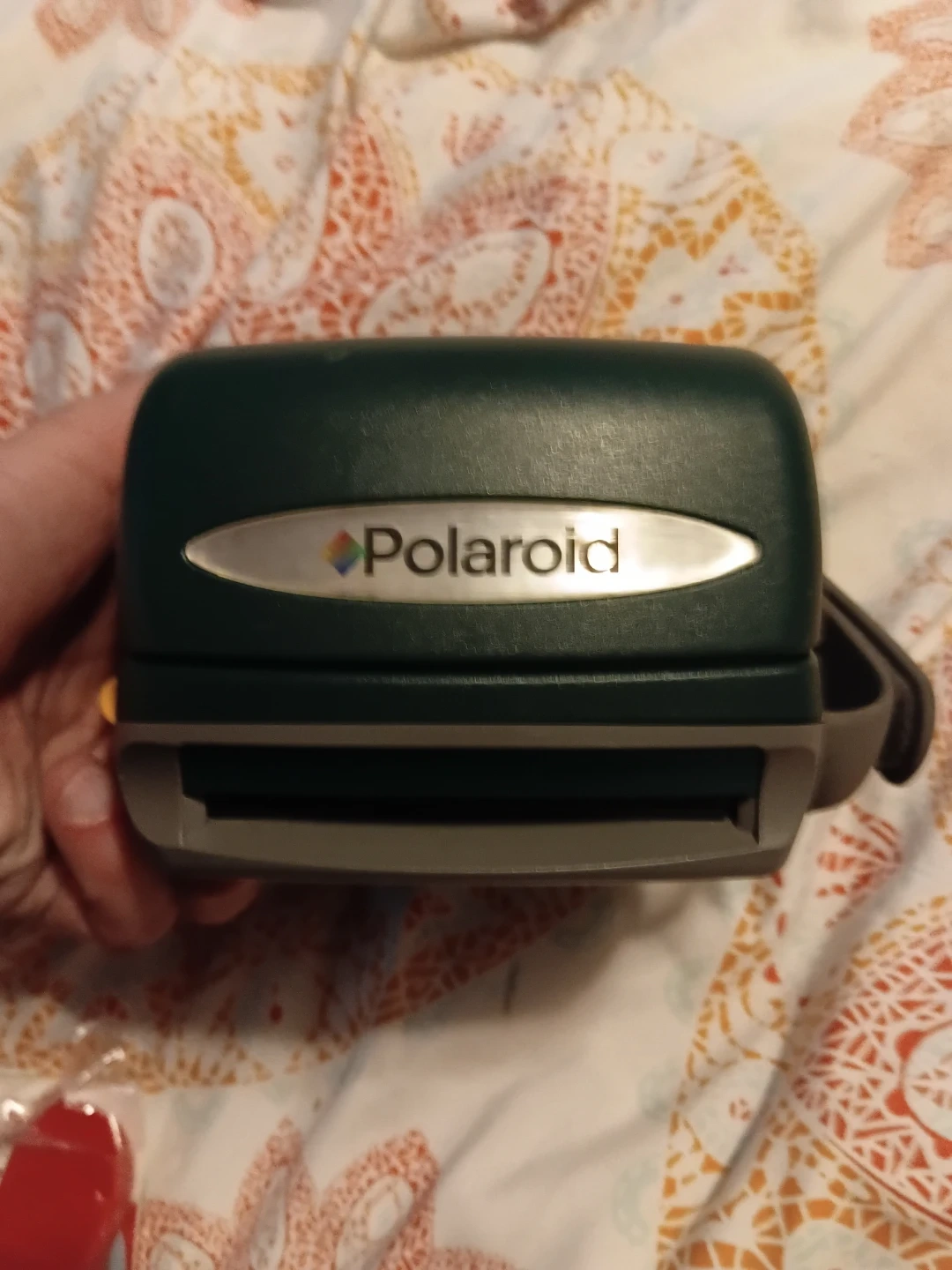 This Polaroid OneStep Express instant camera captures your moments instantly. It's designed for ease of use and quick photo development. The camera is dark green and grey.