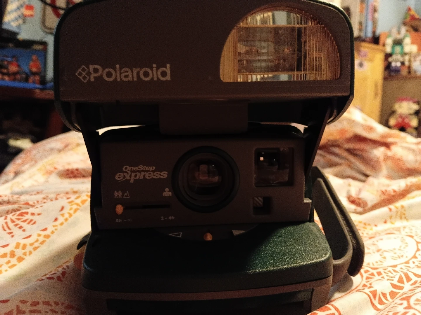 This Polaroid OneStep Express instant camera captures your moments instantly. It's designed for ease of use and quick photo development. The camera is dark green and grey.