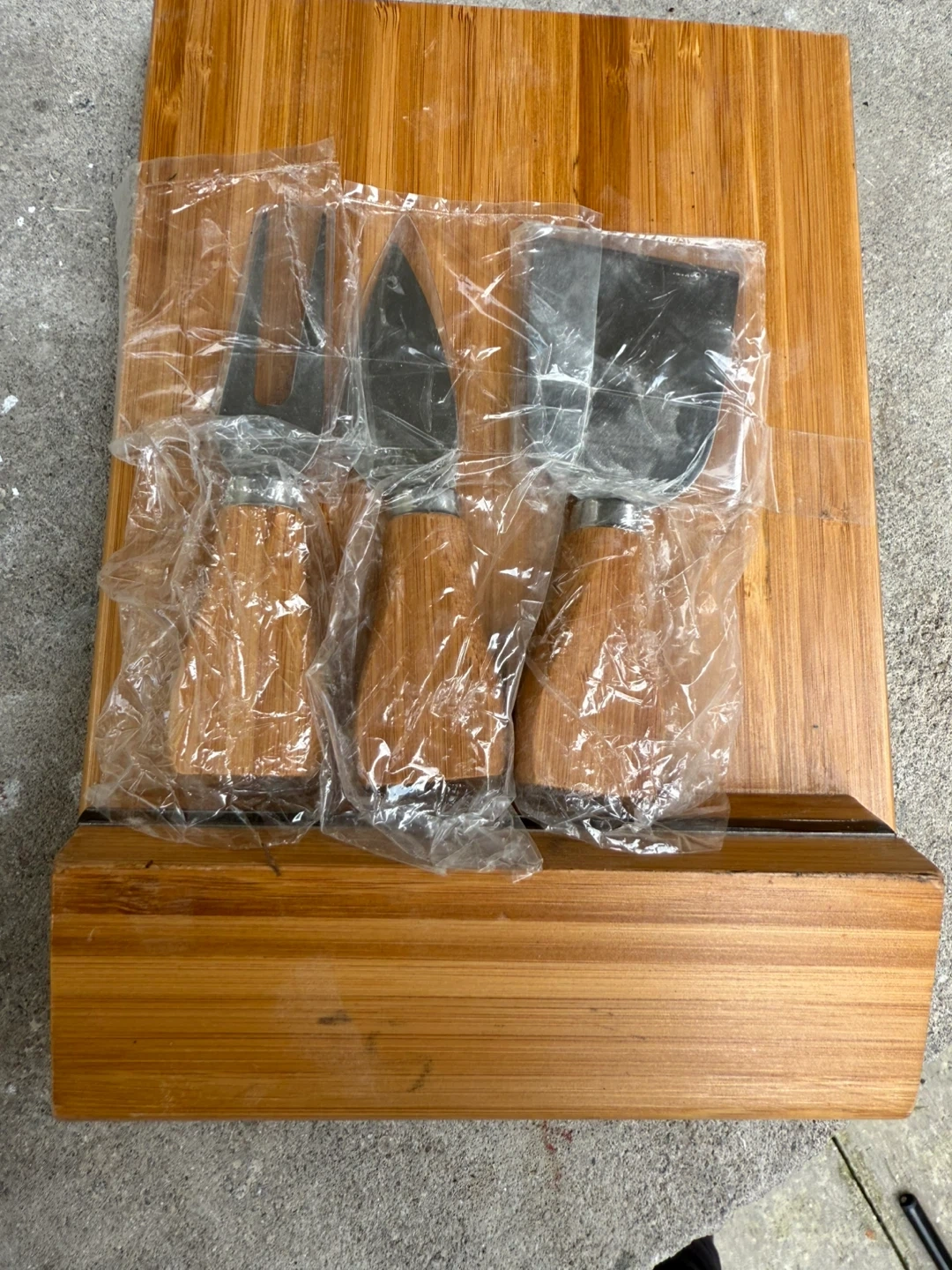 Selling a brand new cheese board set! It comes with three cheese tools, perfect for entertaining or a nice gift. The board and handles appear to be made of wood, adding a touch of natural elegance to your next gathering