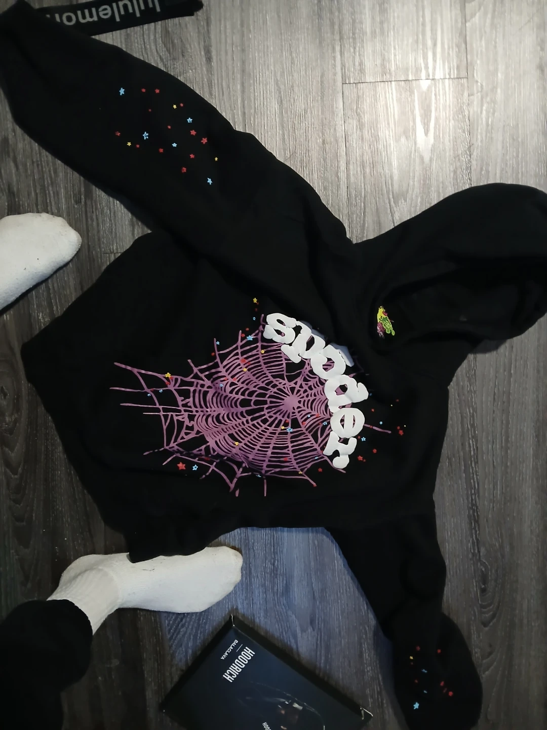 Black Sp5der hoodie with pink web graphic. Features embroidered stars on the sleeves and hood. Made from a comfortable cotton blend.