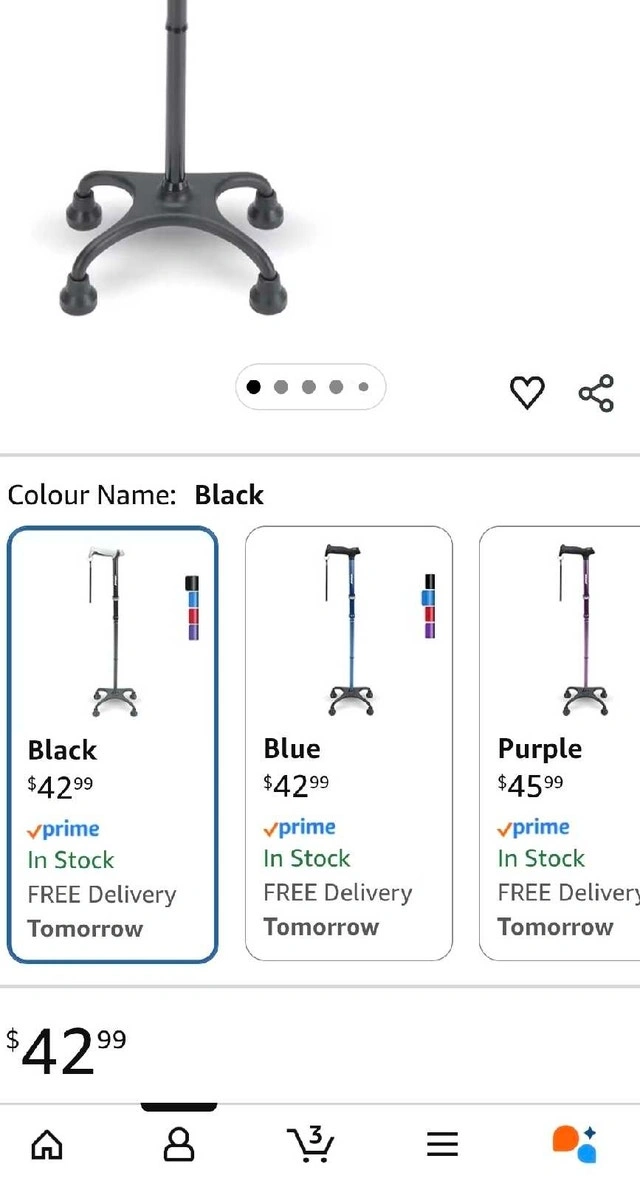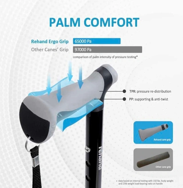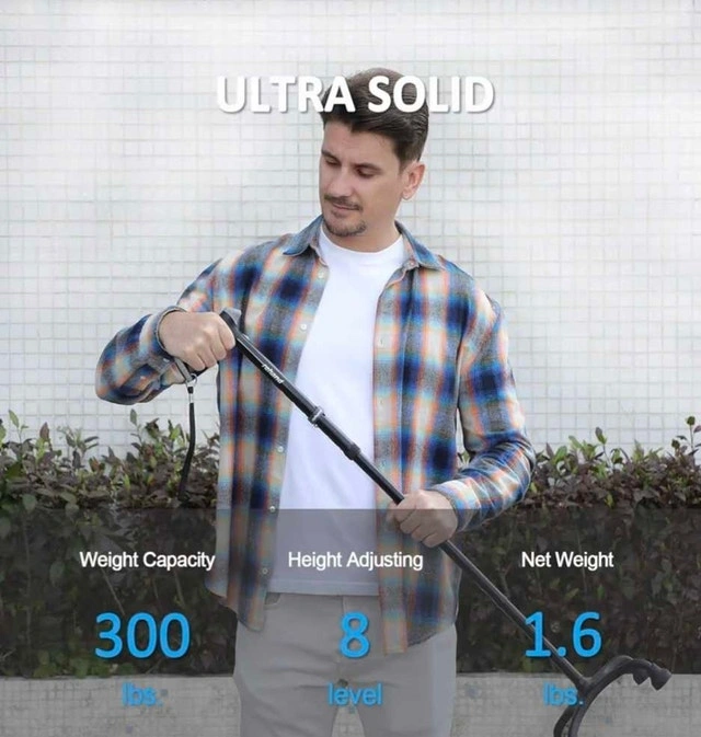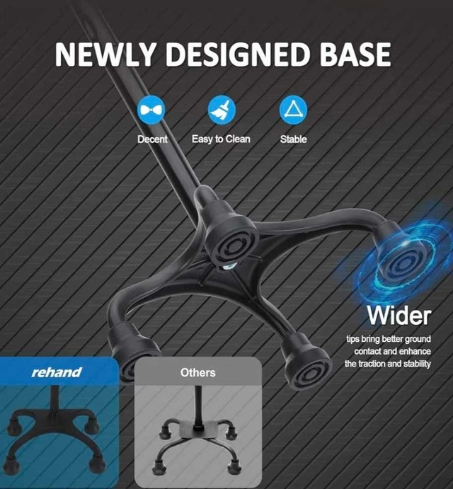 This is a nearly new Rehand Quad Cane, a foldable walking cane for men and women. It has a newly designed base for stability, an ergo grip handle for palm comfort, and is height adjustable. It has a weight capacity of 300lbs. Specifications: Colour: Black, Weight Capacity: 300 lbs, Height Adjusting: 8 levels, Net Weight: 1.6 lbs. The retail price was $42.99.