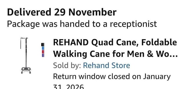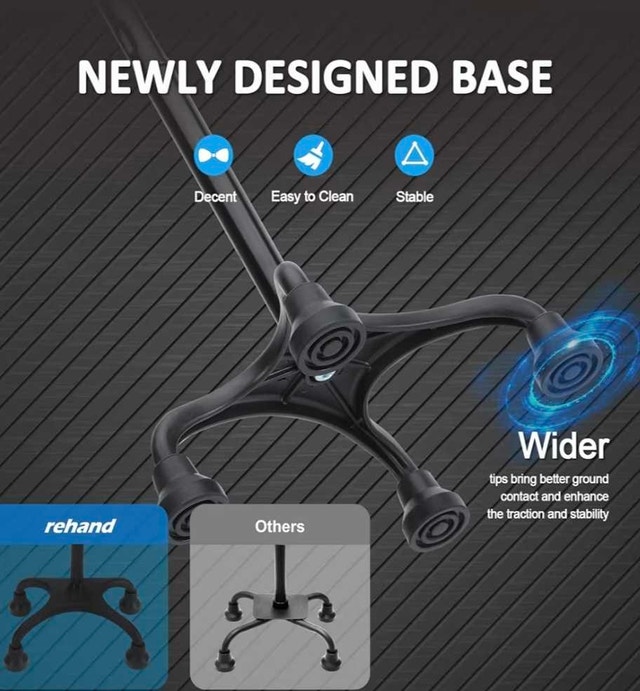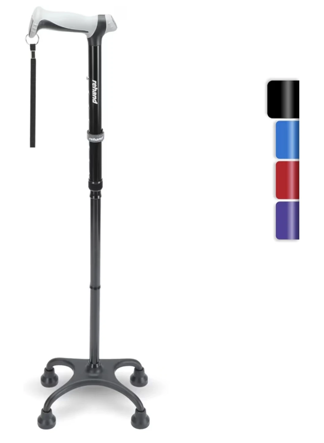This is a nearly new Rehand Quad Cane, a foldable walking cane for men and women. It has a newly designed base for stability, an ergo grip handle for palm comfort, and is height adjustable. It has a weight capacity of 300lbs. Specifications: Colour: Black, Weight Capacity: 300 lbs, Height Adjusting: 8 levels, Net Weight: 1.6 lbs. The retail price was $42.99.