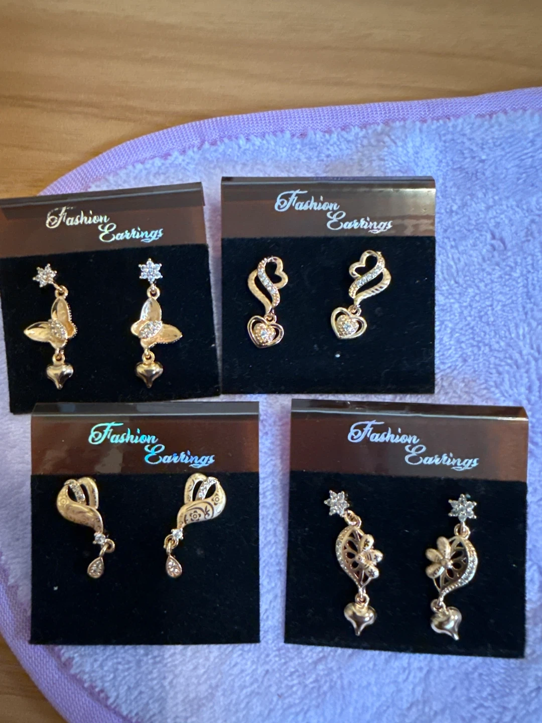 These are a set of four pairs of fashion earrings. They are rose gold toned and feature intricate designs with small rhinestone accents. Two pairs have butterfly motifs, one has a heart design, and the last pair has a floral leaf design. Perfect for adding a touch of sparkle to any outfit!
