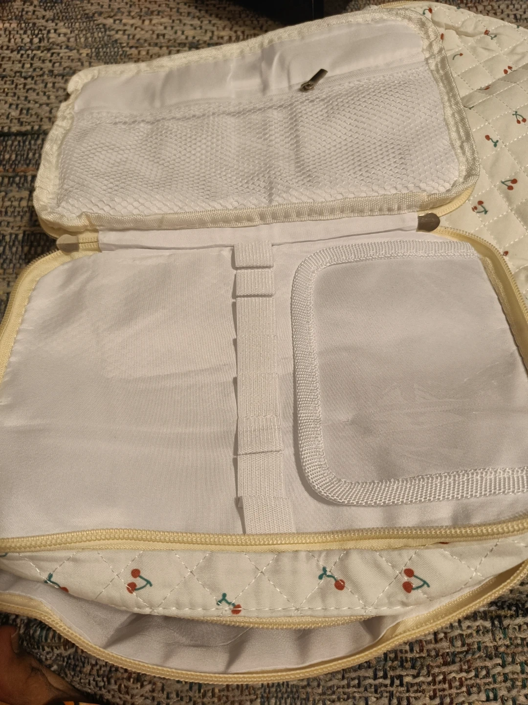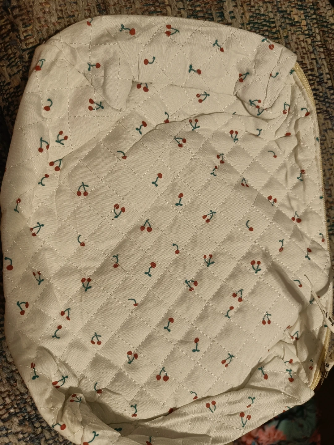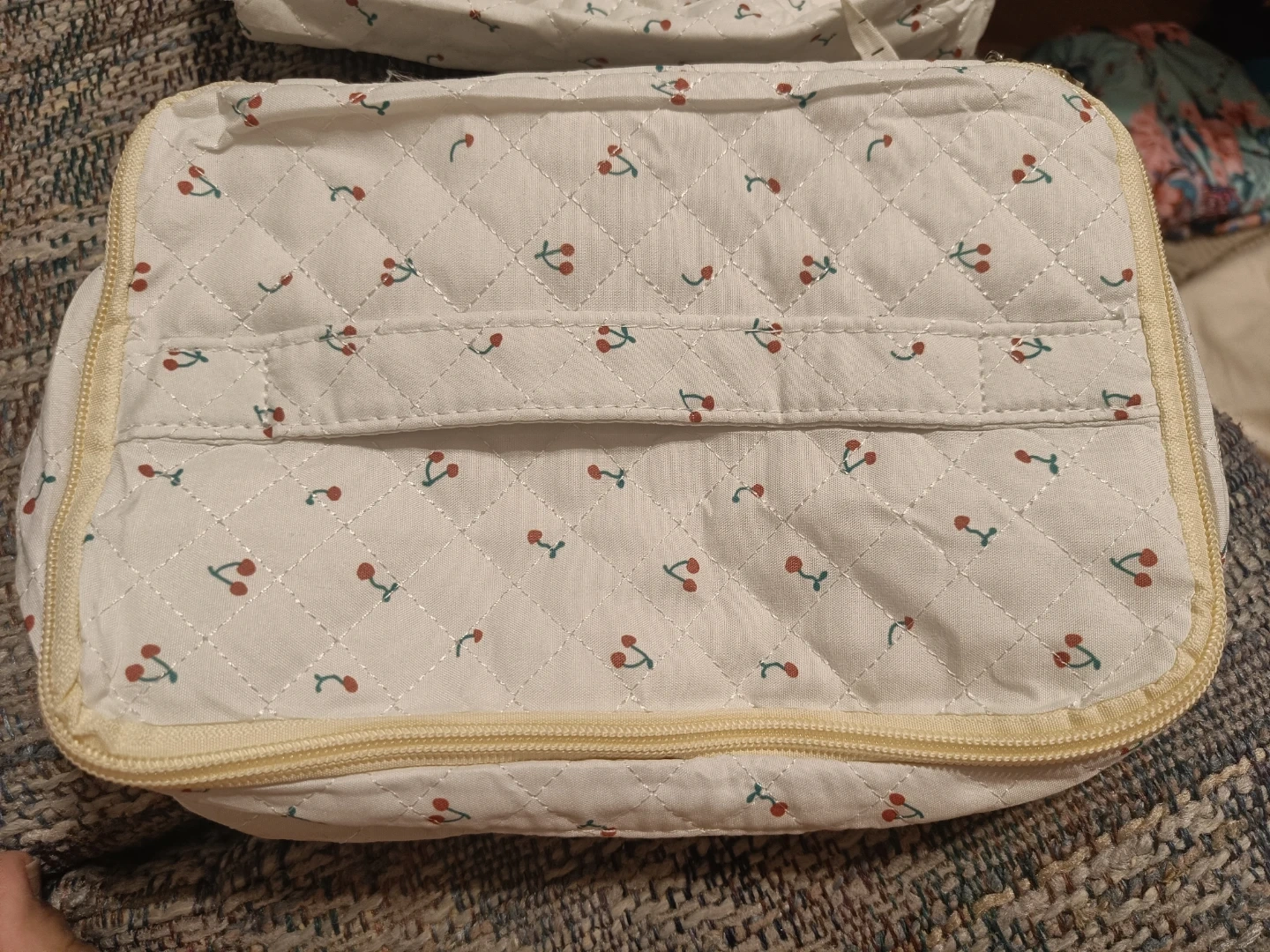 This is a quilted cosmetic bag from Jolly House featuring a cute cherry pattern. It has multiple compartments inside for organization. It's perfect for storing makeup and toiletries while travelling.