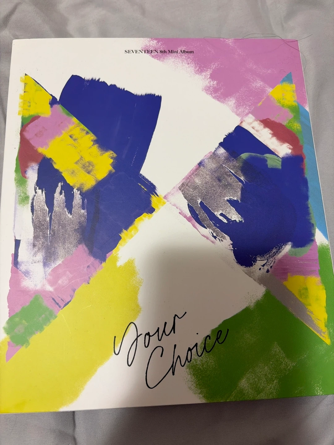 This is the SEVENTEEN 8th Mini Album, titled 'Your Choice'. It features a vibrant, abstract art cover. Album details are printed on the back.
