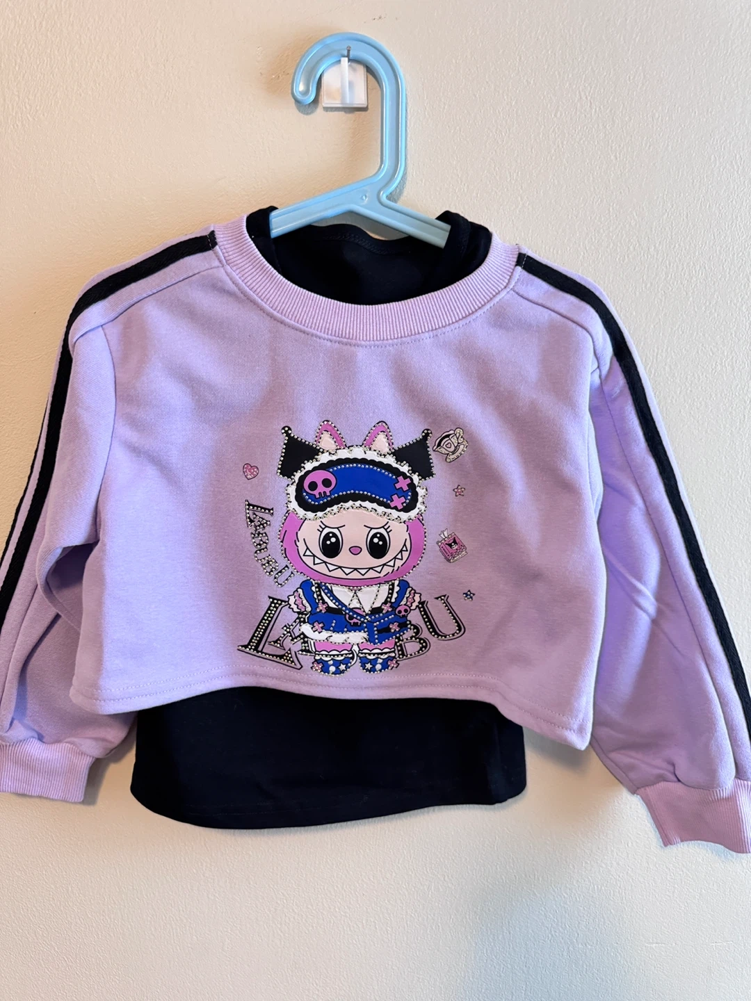 This is a three-piece outfit for kids, featuring a lavender cropped sweatshirt with a black undershirt. The sweatshirt has black striped sleeves and sparkle Labubu. It's paired with matching lavender cargo pants that also have black stripes. This set is super stylish for young ones!