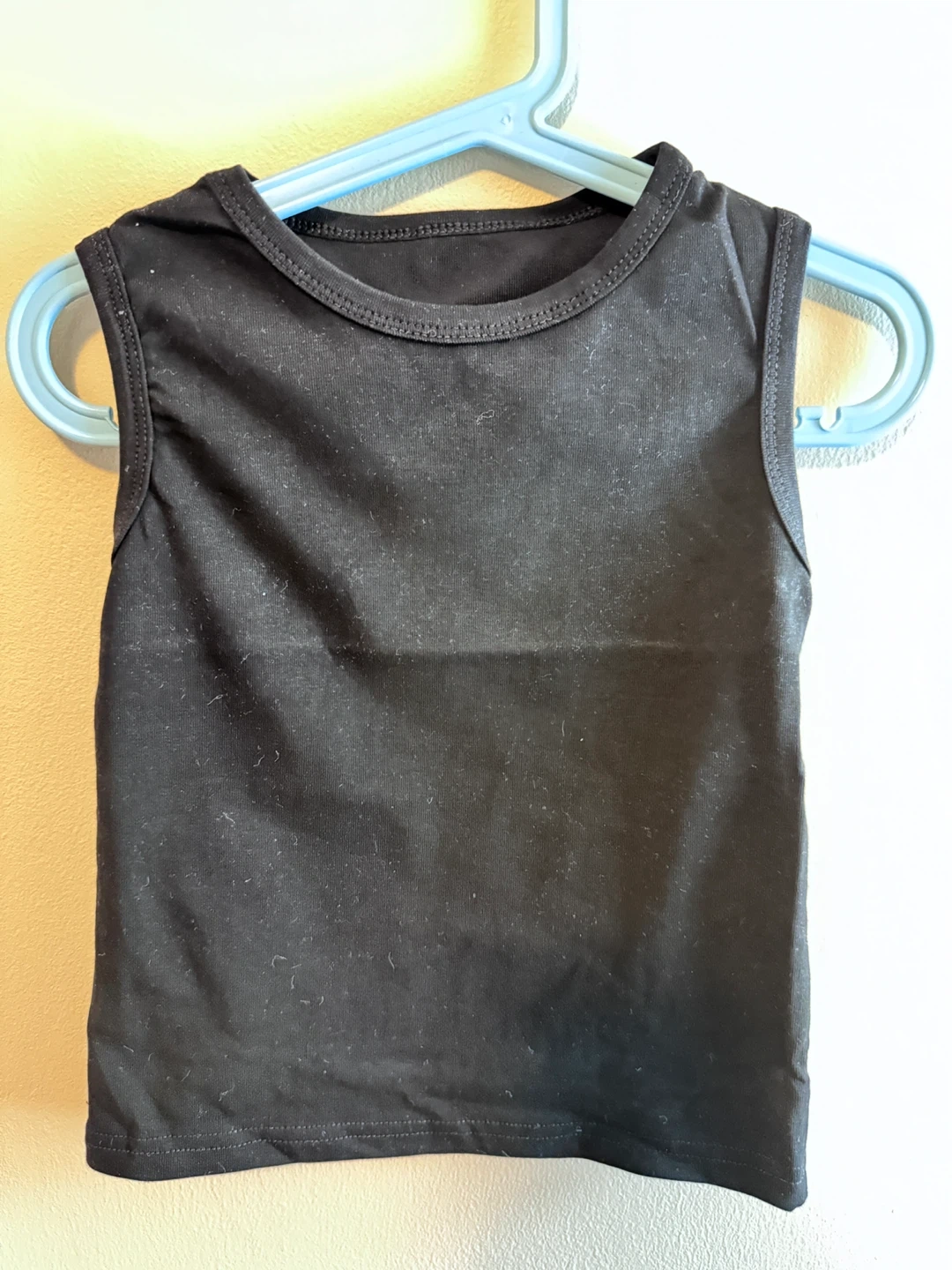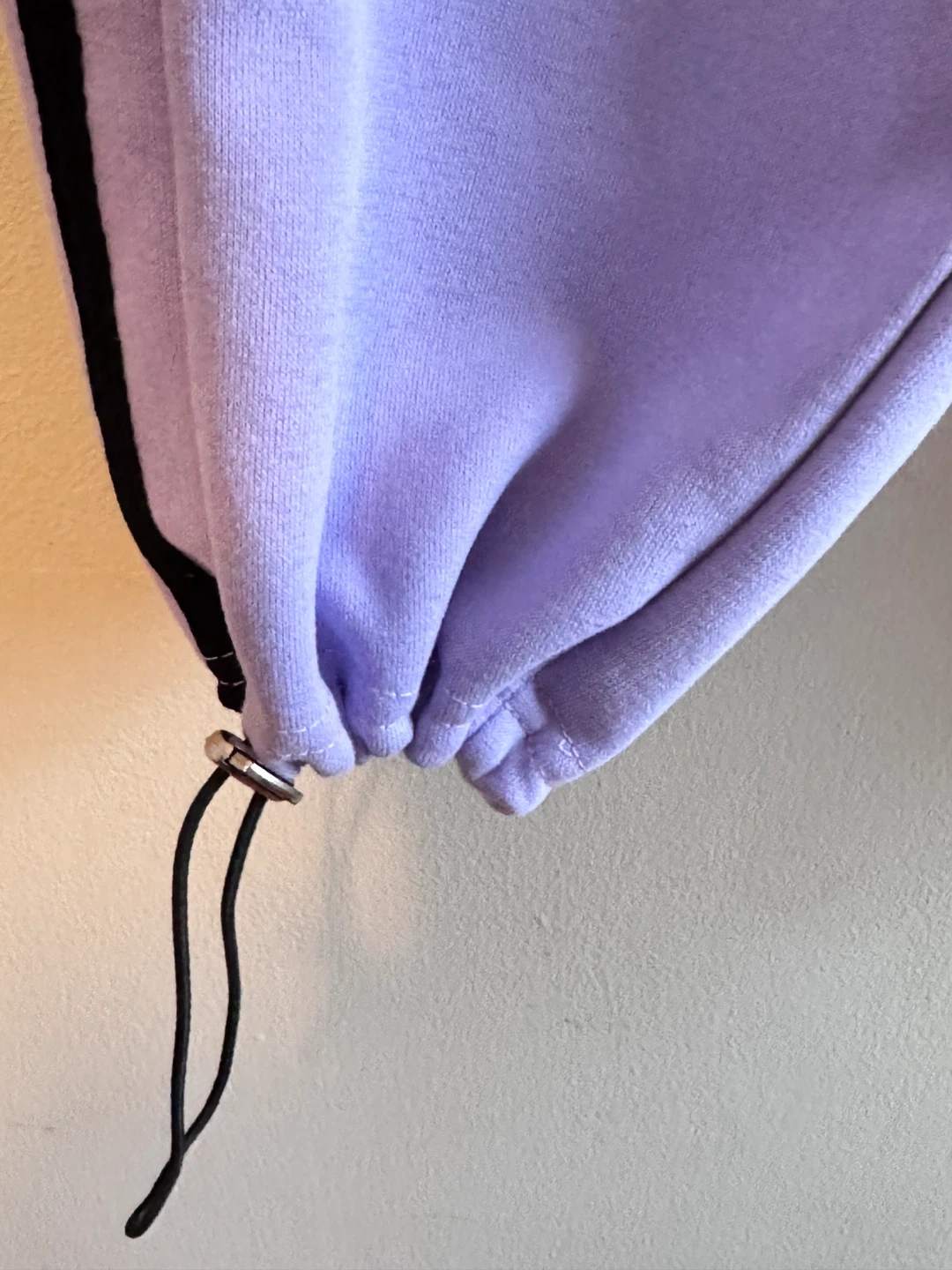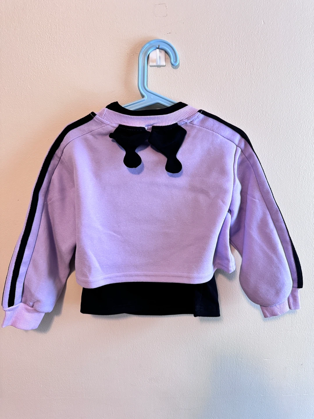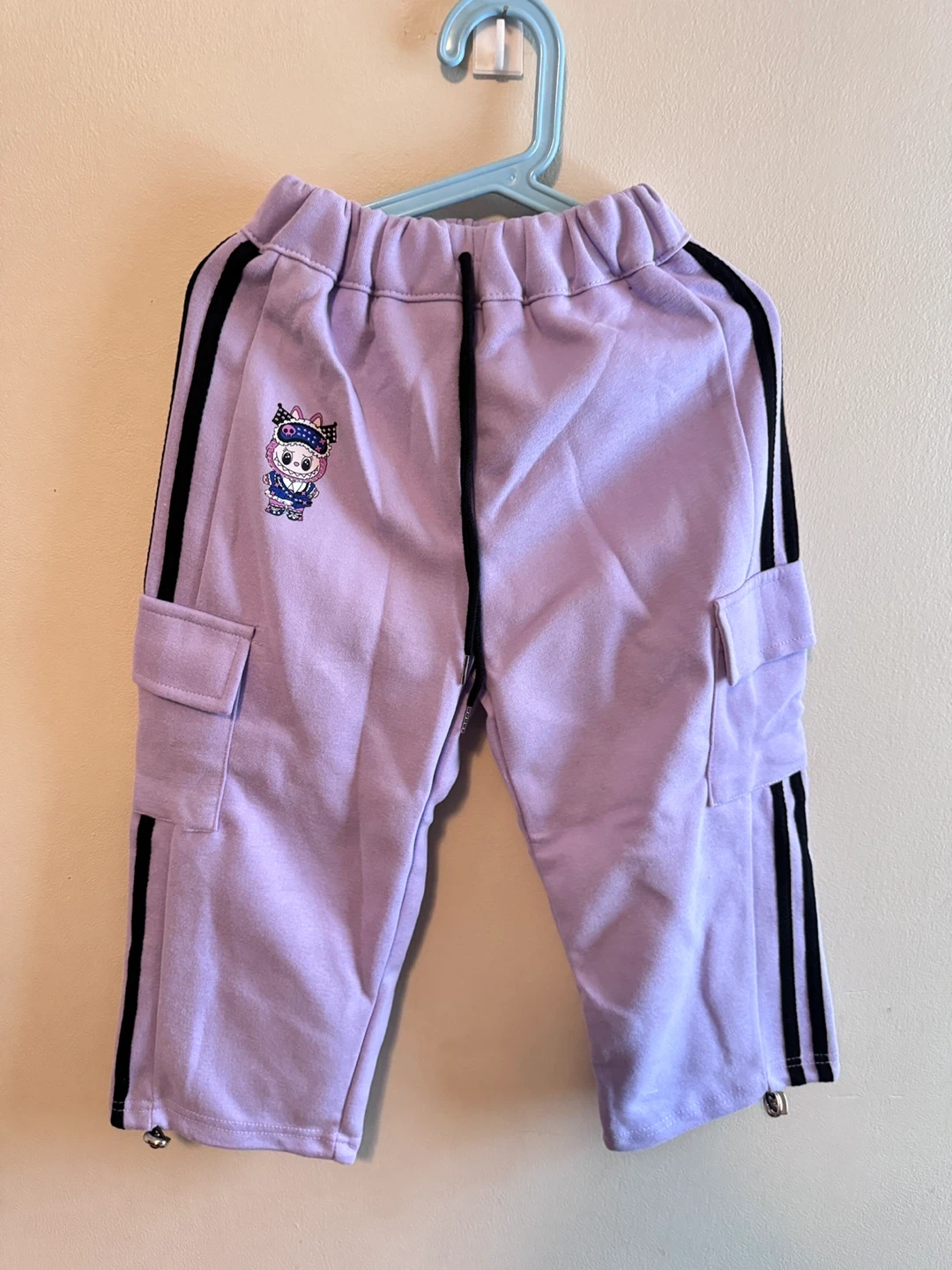 This is a three-piece outfit for kids, featuring a lavender cropped sweatshirt with a black undershirt. The sweatshirt has black striped sleeves and sparkle Labubu. It's paired with matching lavender cargo pants that also have black stripes. This set is super stylish for young ones!