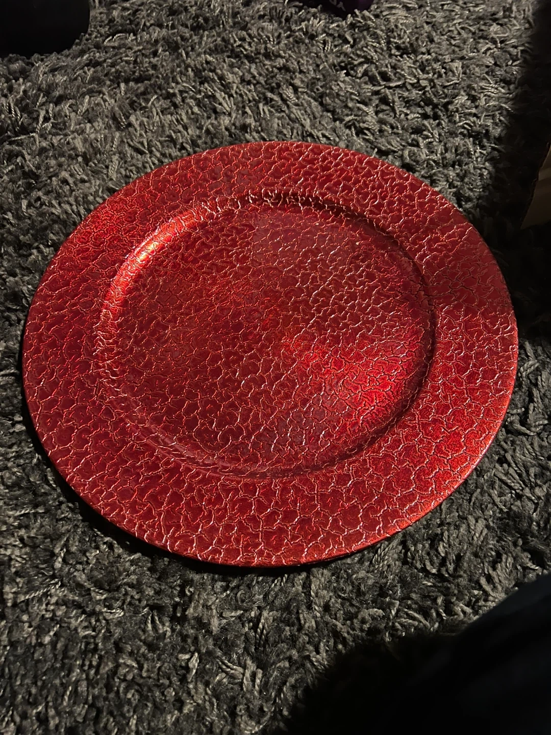 decorative charger plates. One red with a cracked glass effect, and one silver with a distressed metallic finish.intended for decoration only. These add a touch of elegance to your table setting!