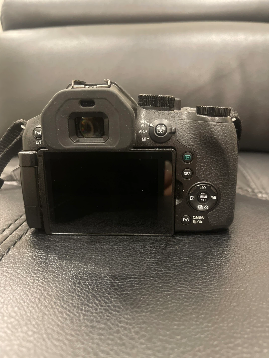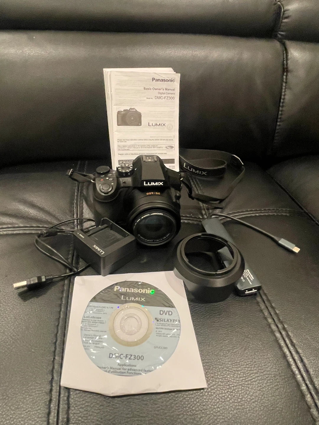 Selling a Panasonic Lumix DMC-FZ300 digital camera. It comes with the box and included components such as the charger and instructions. Great for capturing high-quality photos and videos!
