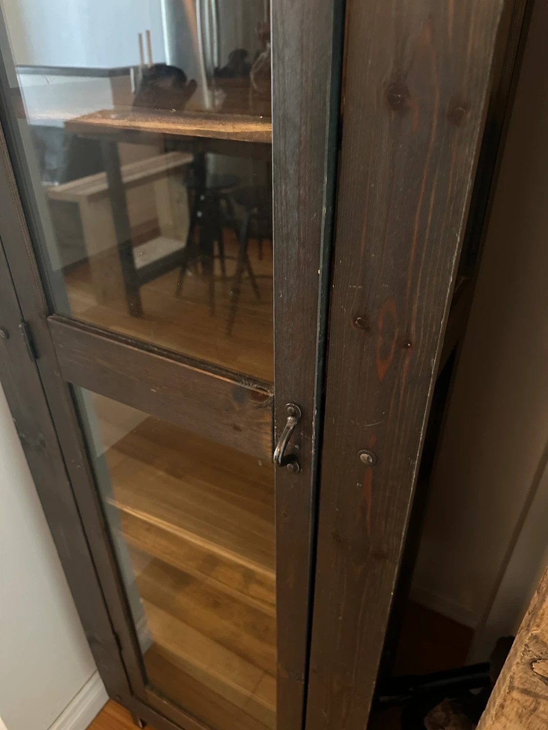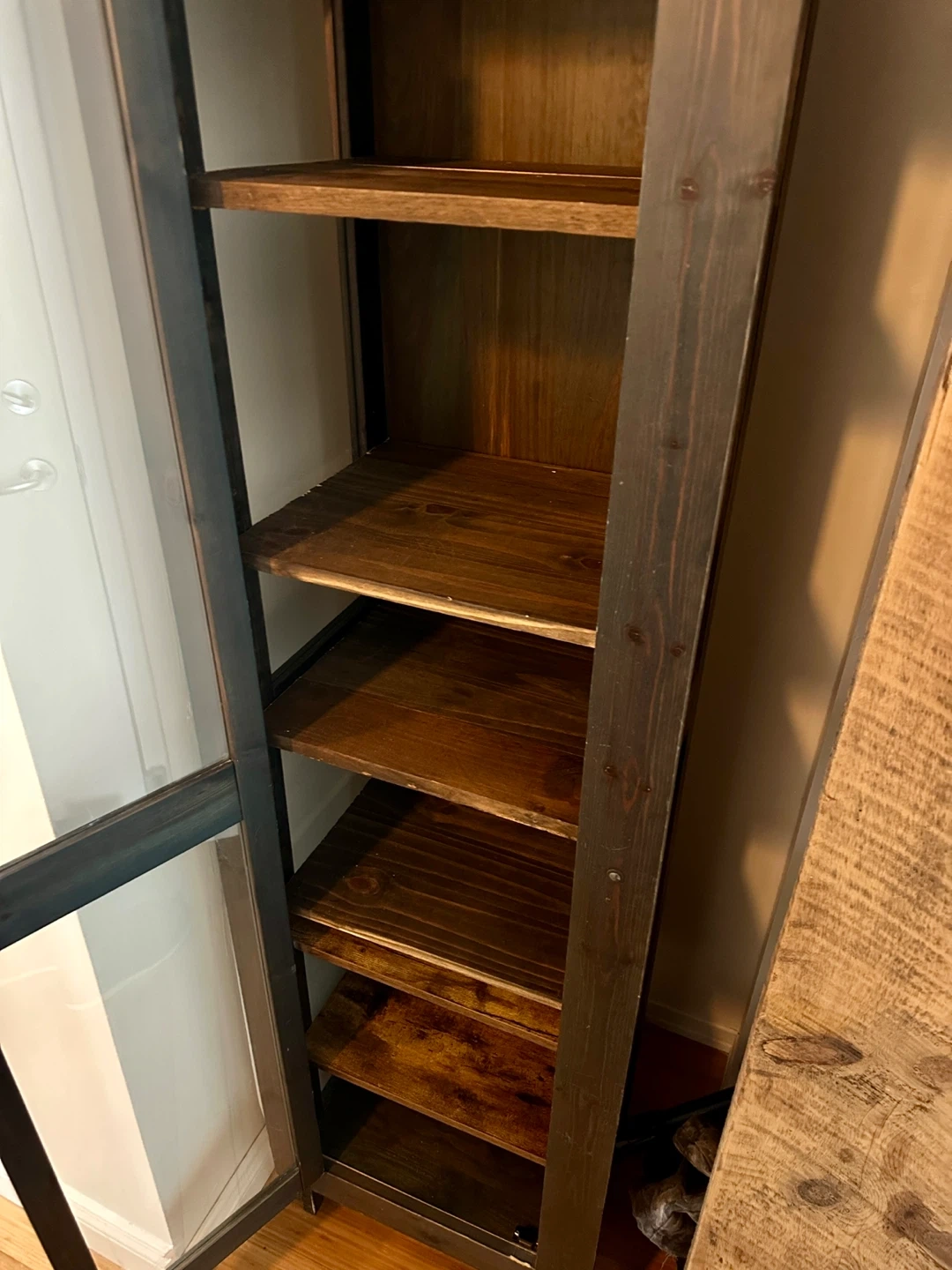 A nice dark wood shelf cabinet w shelves glass panels great for shoes, books, art etc.