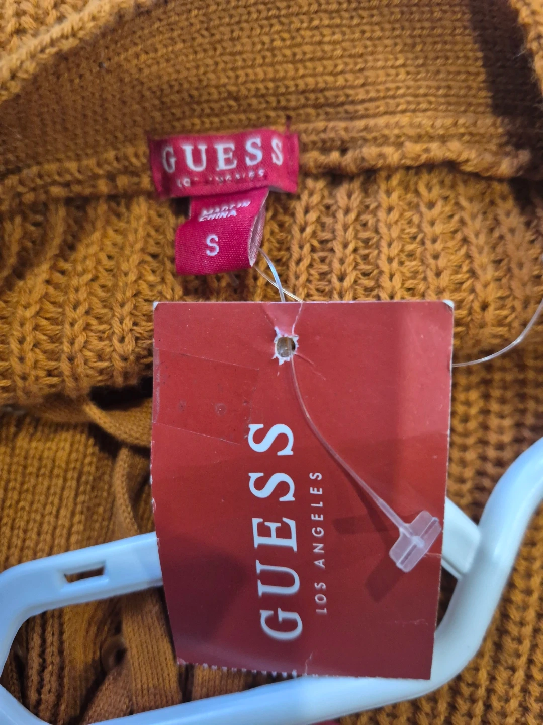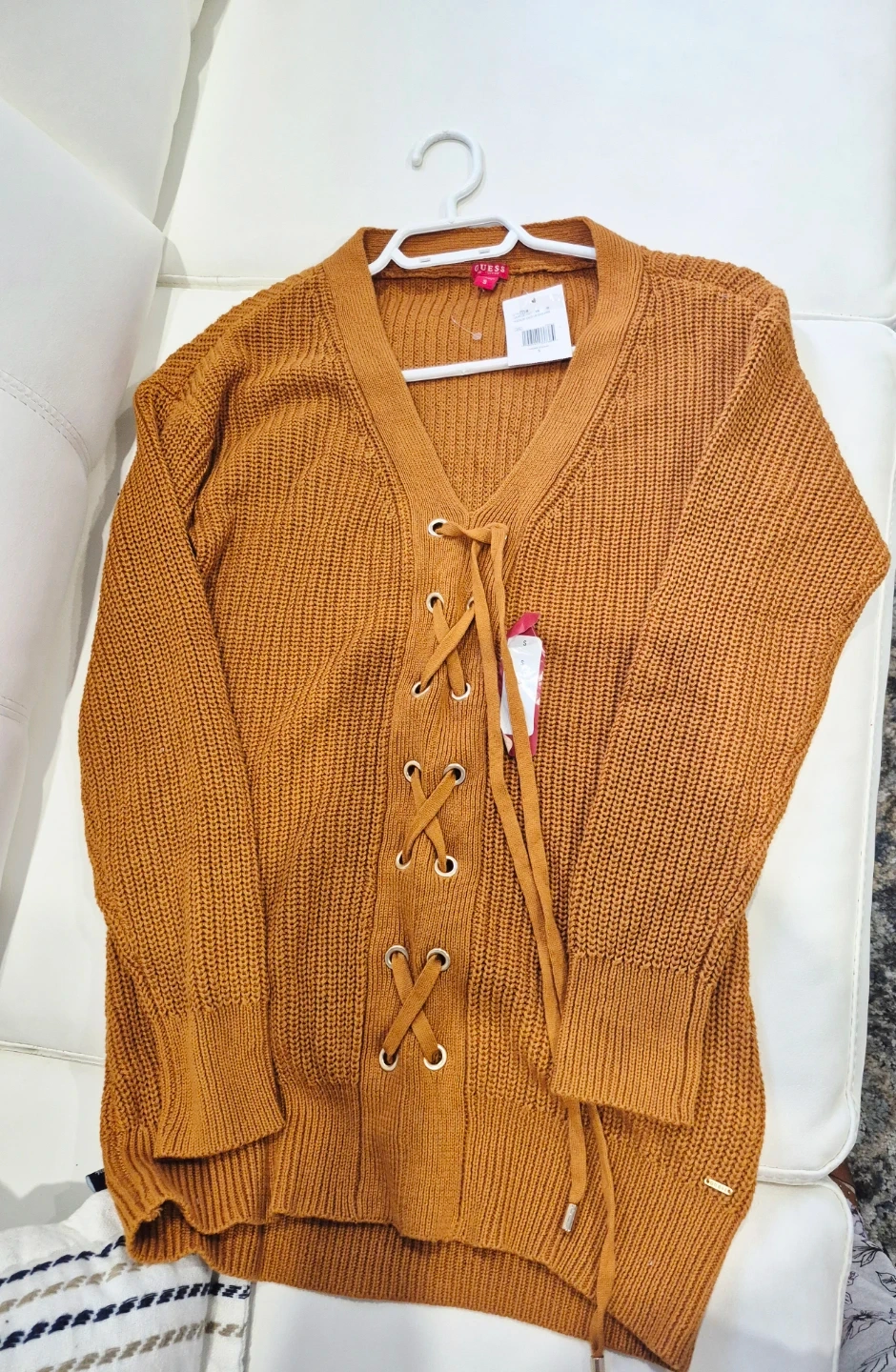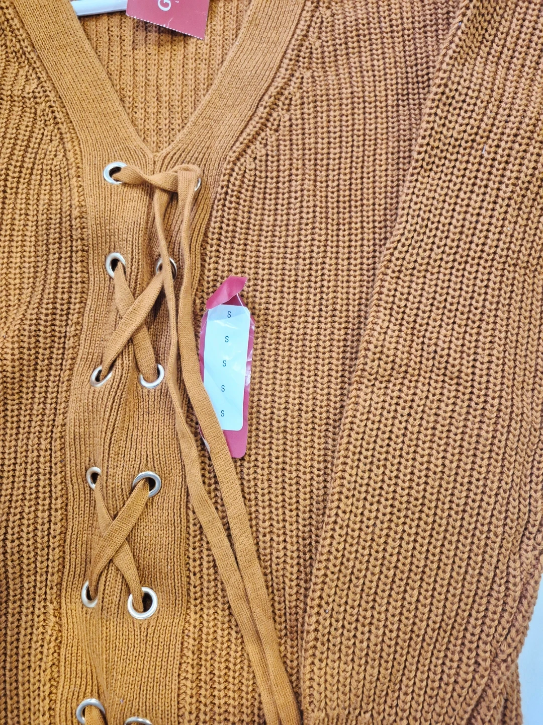 This is a Guess V-neck sweater with a lace-up front. It's a size small and features a ribbed knit texture. The colour is a warm rust or burnt orange.